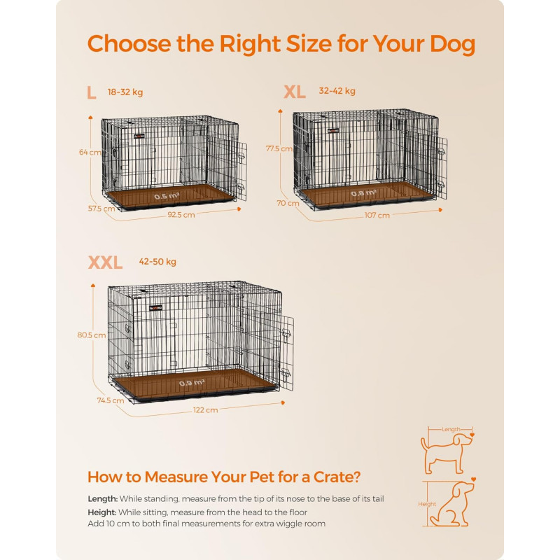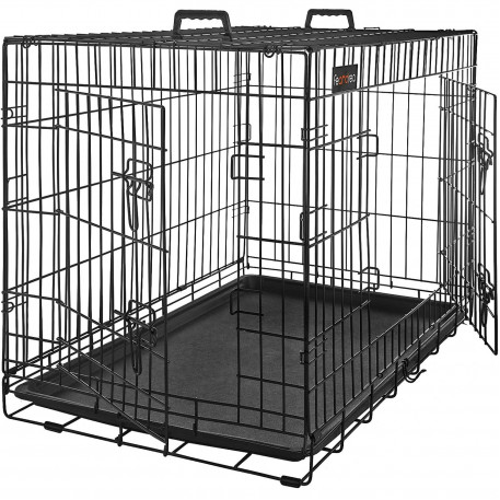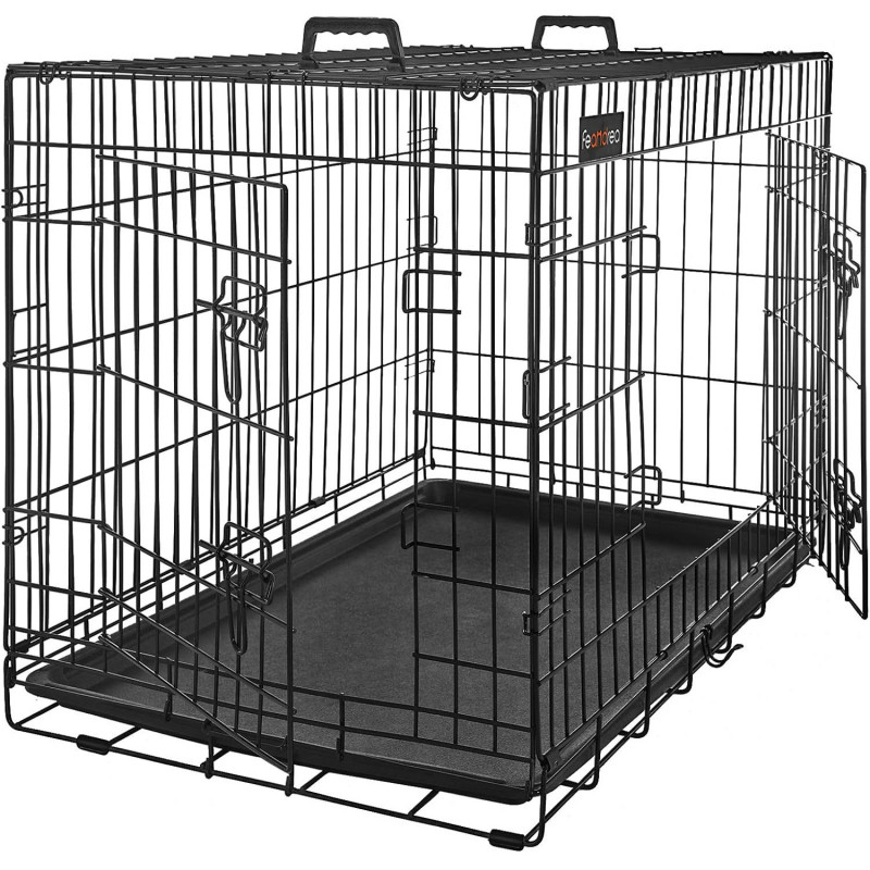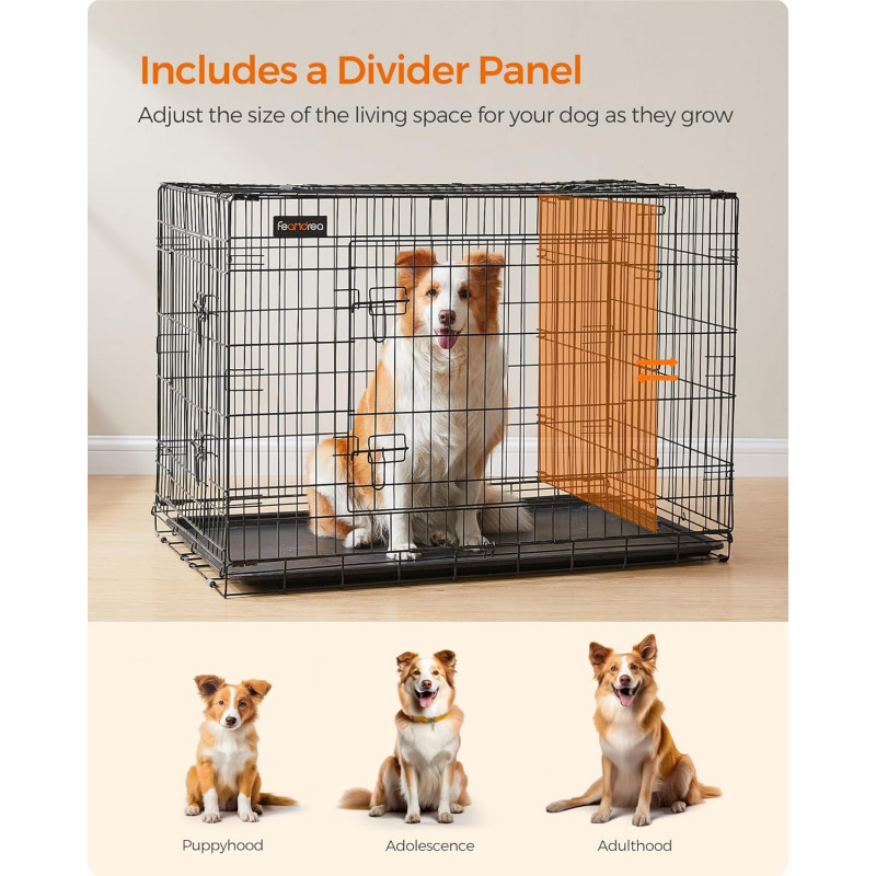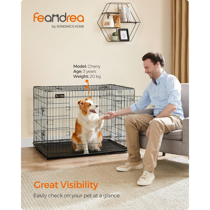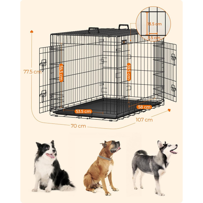 Dimensiuni: 107 x 70 x 77,5 cm (L x l x i)Greutate: 14.9 kg Note FEANDREA: Nu stati in picioare sau nu va asezati pe aceasta cusca. Nu asezati niciun obiect pe cusca.Cusca nu este o jucarie. Este interzis copiilor sa se urce pe cusca si sa se joace in ea.Va recomandam insistent sa va asigurati ca zgarda animalului dvs. de companie nu se incurca in timpul transportului. Este interzis sa puneti franghii in cusca.Pentru masuratori, exista o toleranta generala de 1-2 cm fata de cifrele prezentate pe pagina web.Va rugam sa masurati dimensiunea cainelui dvs. pentru a alege modelul produsului nostru care i se potriveste.Desi cusca pentru caini FEANDREA este fabricata din sarma metalica foarte rezistenta, aceasta poate fi deformata de forte repetate, cum ar fi muscaturi sau labute. Va rugam sa va obisnuiti mai intai cainele cu cusca, astfel incat sa se simta confortabil.