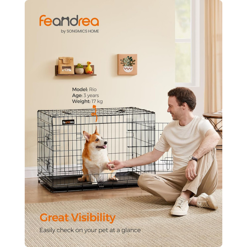 Sigur si confortabil: Fabricat din sarma de metal durabila si puternica si finisat cu o suprafata neteda, rezistenta la rugina, fara margini ascutite, aceasta cusca mare ofera un spatiu sigur si confortabil pentru cainele dvs. Usi duble, incuietori duble, securitate dubla: Cu 2 usi, aceasta cusca pentru caini faciliteaza intrarea si iesirea prietenului tau cu blana. Incuietorile duble in forma de L impiedica prietenul tau cu blana sa deschida singur usile.