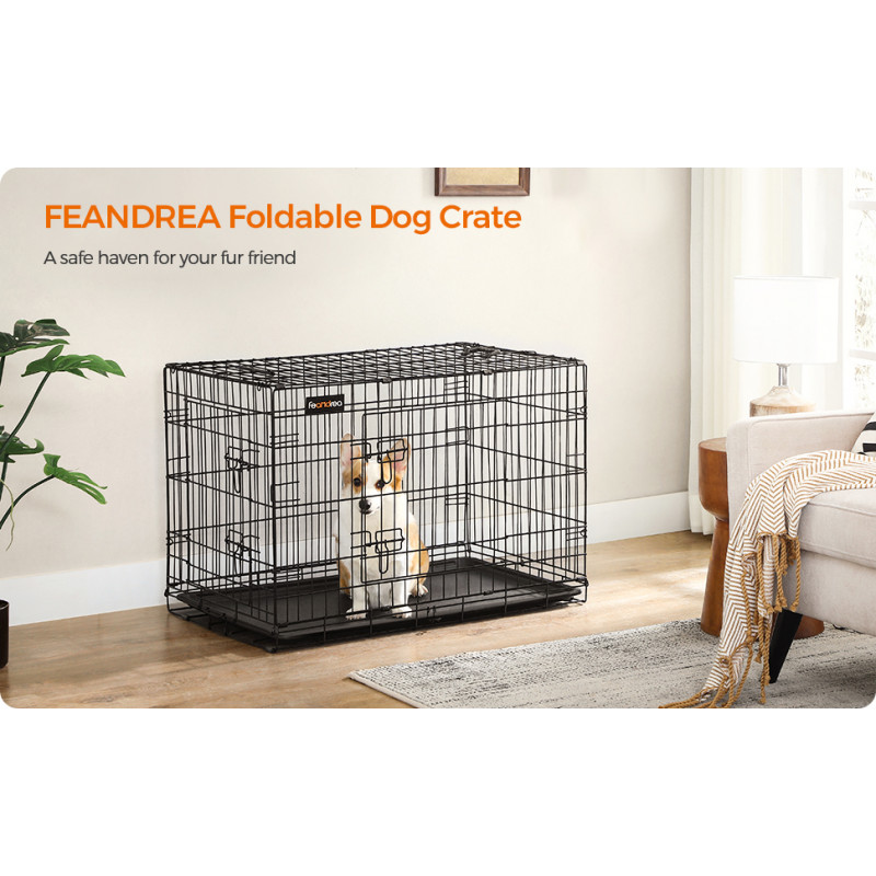 Usor de curatat: Lada pliabila pentru caine vine cu o tava extrasa in partea inferioara, astfel incat sa o poti glisa cu usurinta pentru a curata si sa pastrezi locul cainelui curat - prietenul tau cu blana iti va multumi pentru asta!