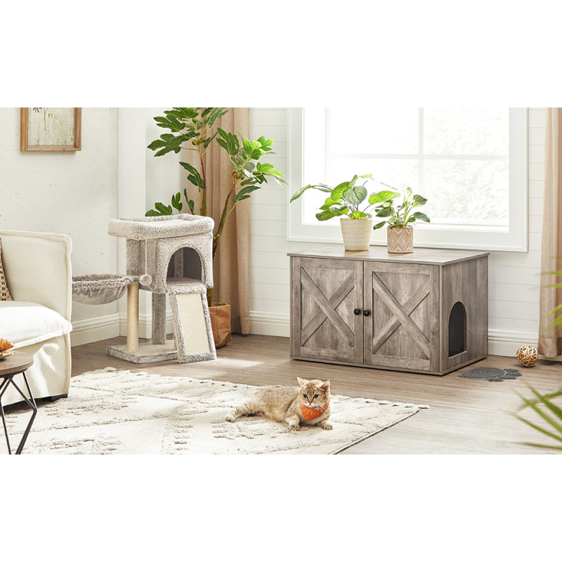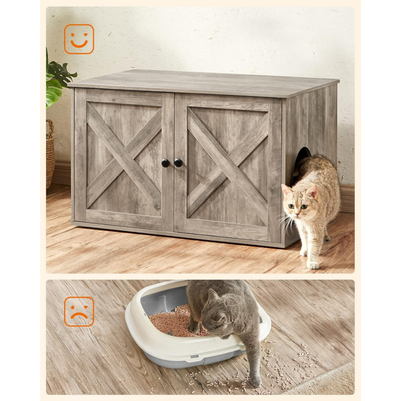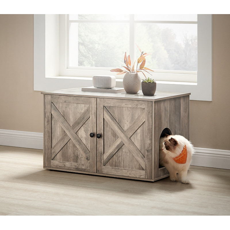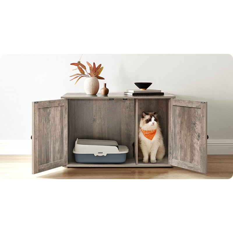 Cu separatorul interior, capacitatea maxima de incarcare statica a blatului este de 60 kg. Fara separator interior, acesta este coborat la 10 kg. Cu un finisaj alb si usi de tip hambar, aceasta litiera se integreaza cu usurinta in majoritatea stilurilor de casa, ascunzand in acelasi timp ceea ce nu este placut de vazut. Mai multa intimitate, mai putin miros: Datorita constructiei inchise, aceasta litiera pentru pisici ofera un loc privat unde pisica dvs. se simte in siguranta pentru a-si face urgentele si mai putina mizerie – o solutie avantajoasa pentru ambele parti!