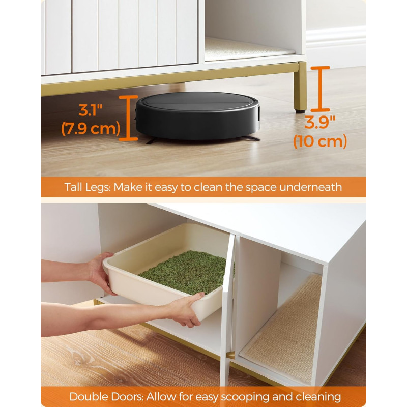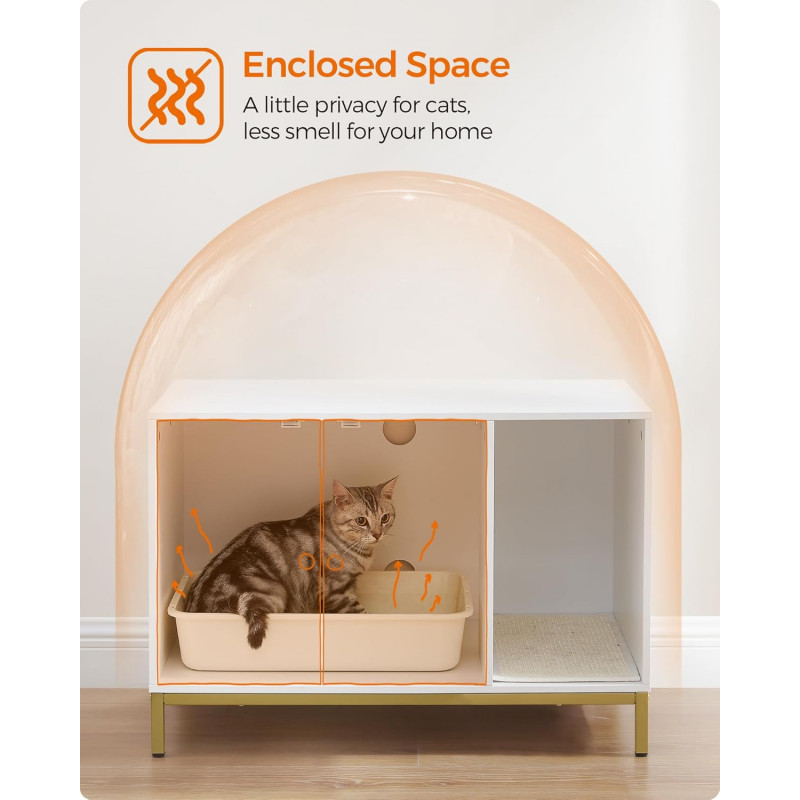 Scurta descriere: Dulap mascat pentru litiera, conceput pentru a integra discret zona pisicii in decorul locuintei. Designul modern cu cadru metalic auriu permite utilizarea produsului atat ca spatiu pentru litiera sau culcus, cat si ca masa laterala sau piesa de mobilier functionala.