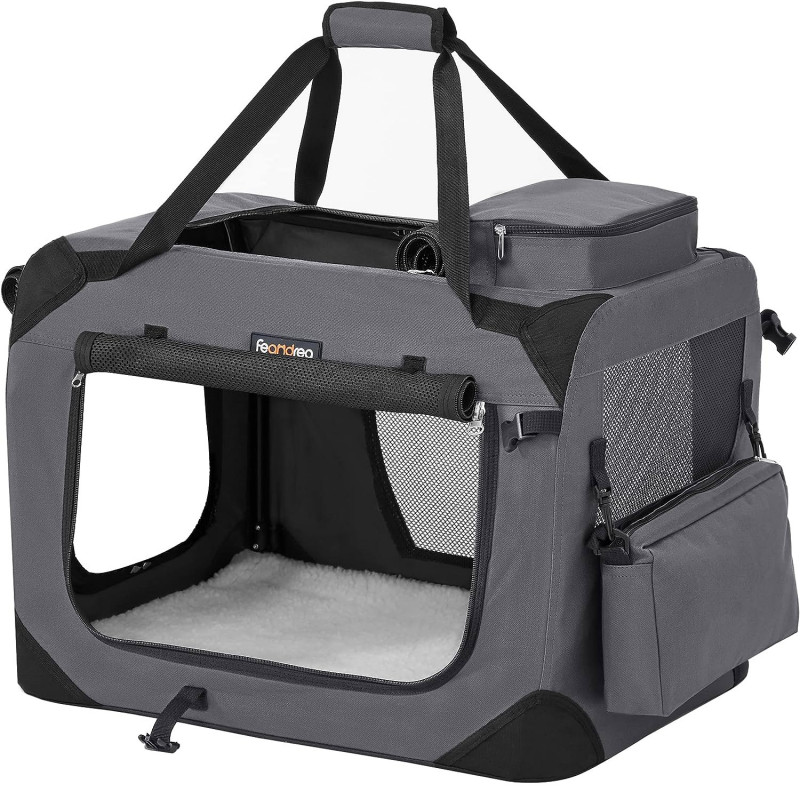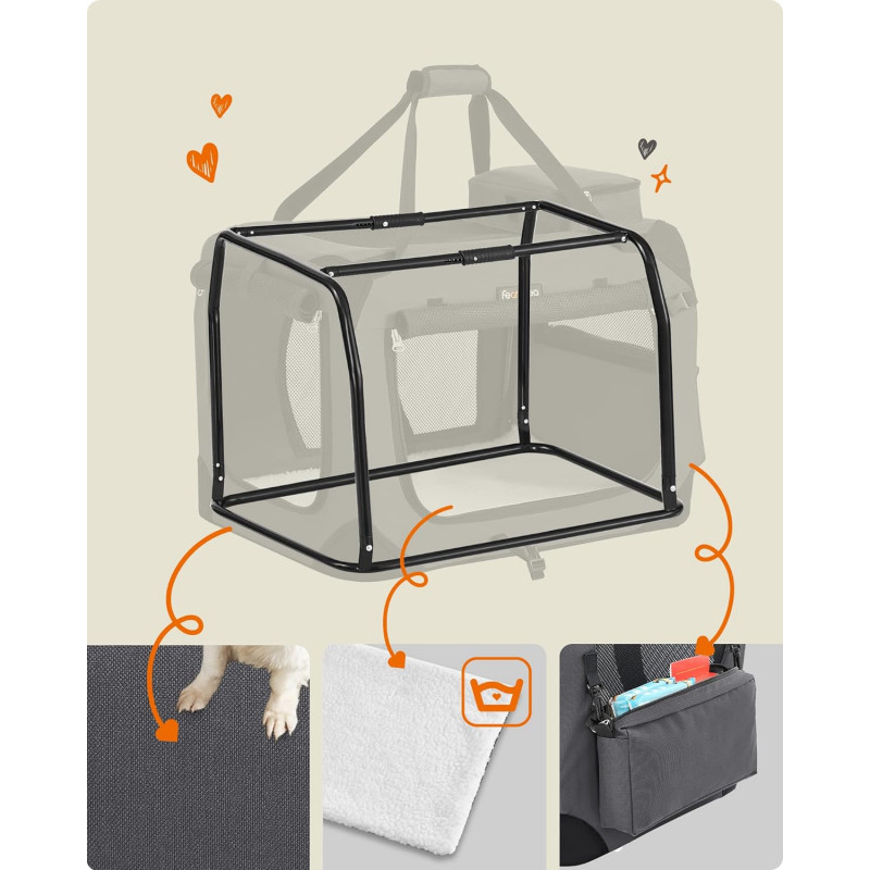 Deschideri multiple si plasa respirabila: Fereastra din plasa, interior spatios - Prietenul tau blanos se poate bucura si de aerul proaspat. Sigura, confortabila, practica: Geanta portabila pentru caini este realizata din cadru de otel si tesatura Oxford durabila si are in interior un covor de plus usor de intretinut - un refugiu stabil si confortabil pentru cainele tau. Gustarile, jucariile etc. se potrivesc in cele 2 buzunare laterale.