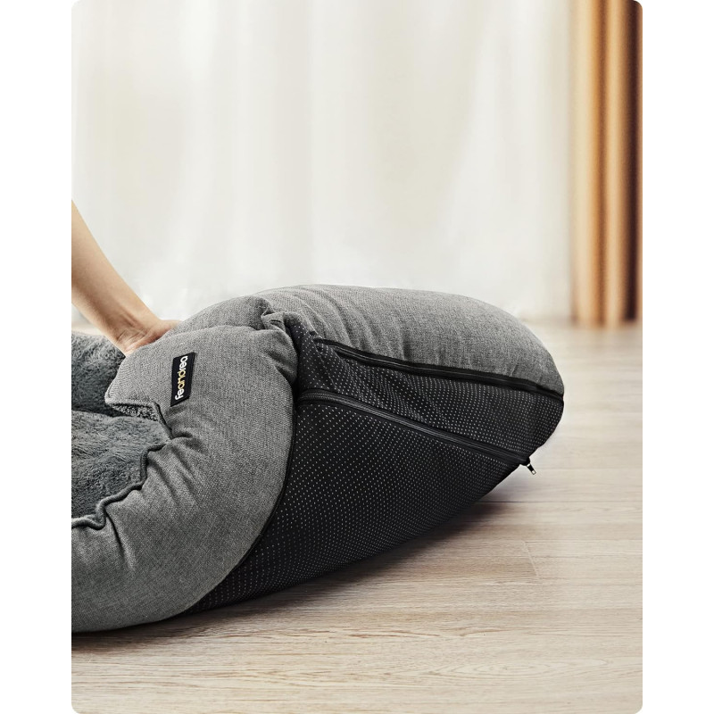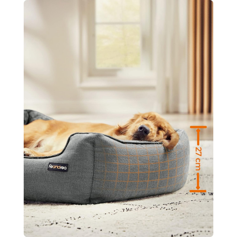 Moale si confortabil: Partea interioara din plus a patului pentru caini este confortabila, partea din mijloc este captusita cu umplutura PP moale, astfel incat prietenul dvs. blanos se poata relaxa si odihni bine in el. Marginile ridicate asigura o buna aderenta: Marginile ridicate si bine captusite ale cosului pentru caini sustin capul si gatul prietenului dvs. blanos, oferindu-i o pozitie de somn sigura si confortabila. Fata de perna detasabila, curatare usoara: Deschideti cele doua fermoare din partea de jos, scoateti captuseala, spalati fata de perna pentru a indeparta murdaria si mirosurile - mai putina munca pentru dvs. si mai multa igiena pentru animalul dvs. de companie.