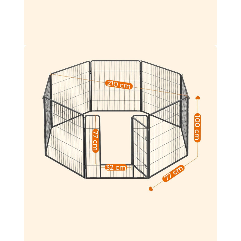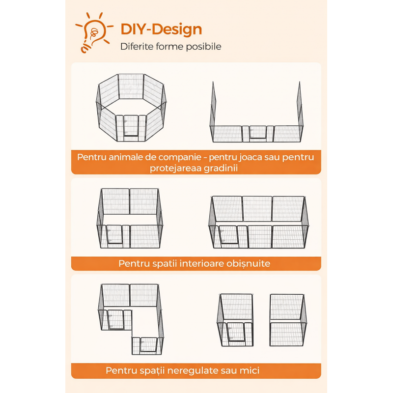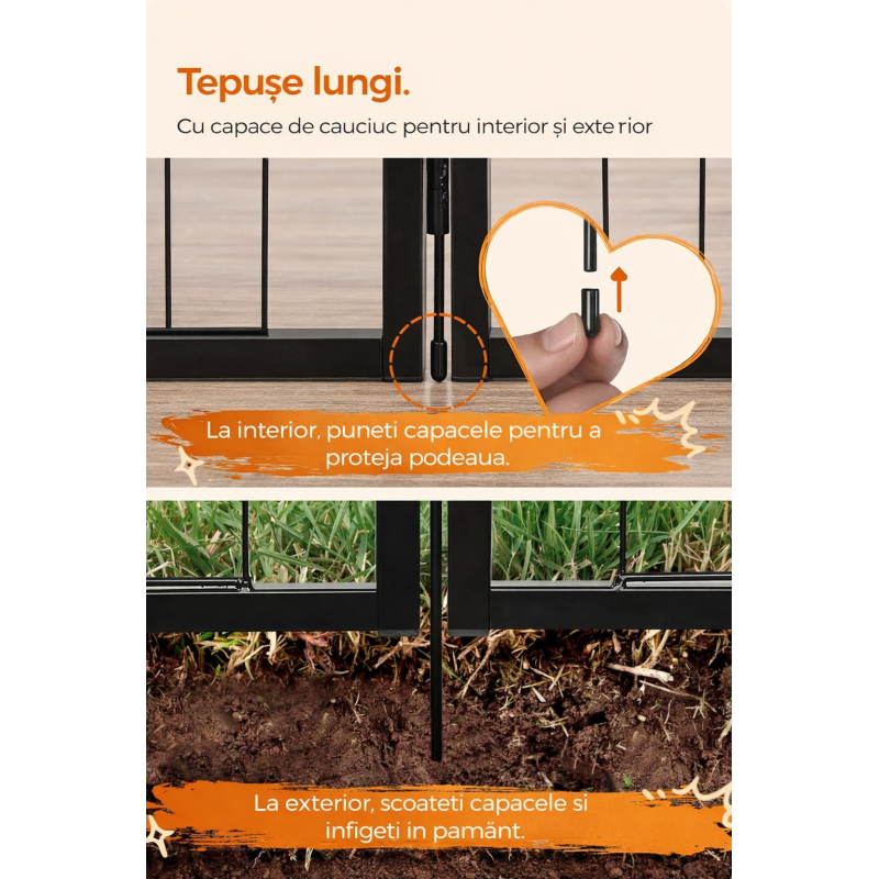 Scurta descriere: Tarc metalic modular pentru caini, pui sau alte animale de companie, conceput pentru siguranta si flexibilitate maxima. Cele 8 panouri permit configurarea in diverse forme, in functie de spatiu si necesitati, fiind potrivit atat pentru interior, cat si pentru exterior.