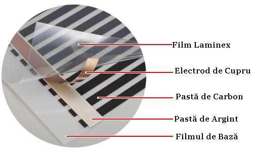 Elementul de încălzire (conductorul electric) este CARBONUL care împreună cu o pastă de argint sunt imprimate pe film PET cu rol de izolaţie şi material ignifug, care urmează să fie combinat cu Laminex Film după ce este adăugat un electrod de folie din cupru.