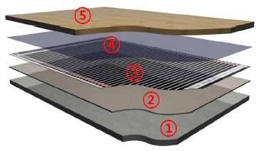 5) podea (lemn sau parchet laminat), 4) folie protectie polietilena, 3) film incalzitor HOT-FILM, 2) izolatie temica, 1) baza beton.