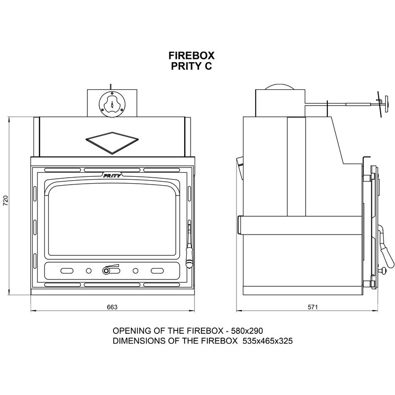 Focar de semineu simpla Prity C poate incalzi 230m³ de aer la o casa izolata sau 166m³ de aer la o casa neizolata.