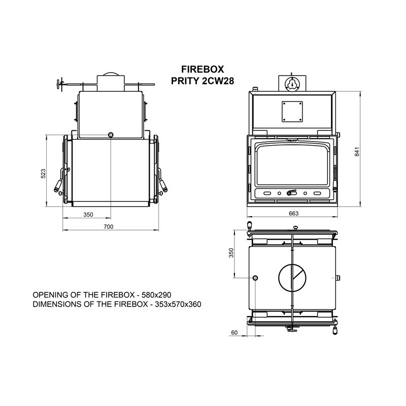 Volumul bazinului de apa este de 28 litri. Focar de semineu tip centrala Prity 2CW28 poate incalzi 507m³ de aer la o casa izolata sau 366m³ de aer la o casa neizolata.