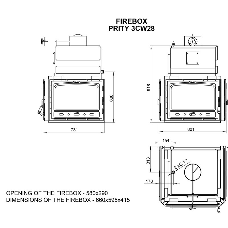 Volumul bazinului de apa este de 28 litri. Focar de semineu tip centrala Prity 3CW28 poate incalzi 507m³ de aer la o casa izolata sau 366m³ de aer la o casa neizolata.