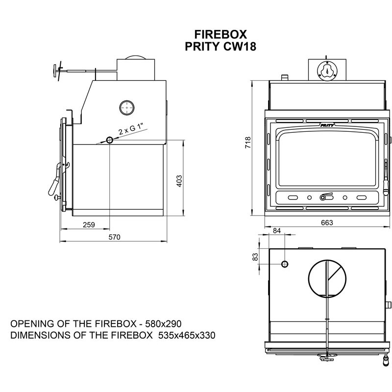 Volumul bazinului de apa este de 26 litri. Focar de semineu tip centrala Prity CW18 poate incalzi 353m³ de aer la o casa izolata sau 255m³ de aer la o casa neizolata.