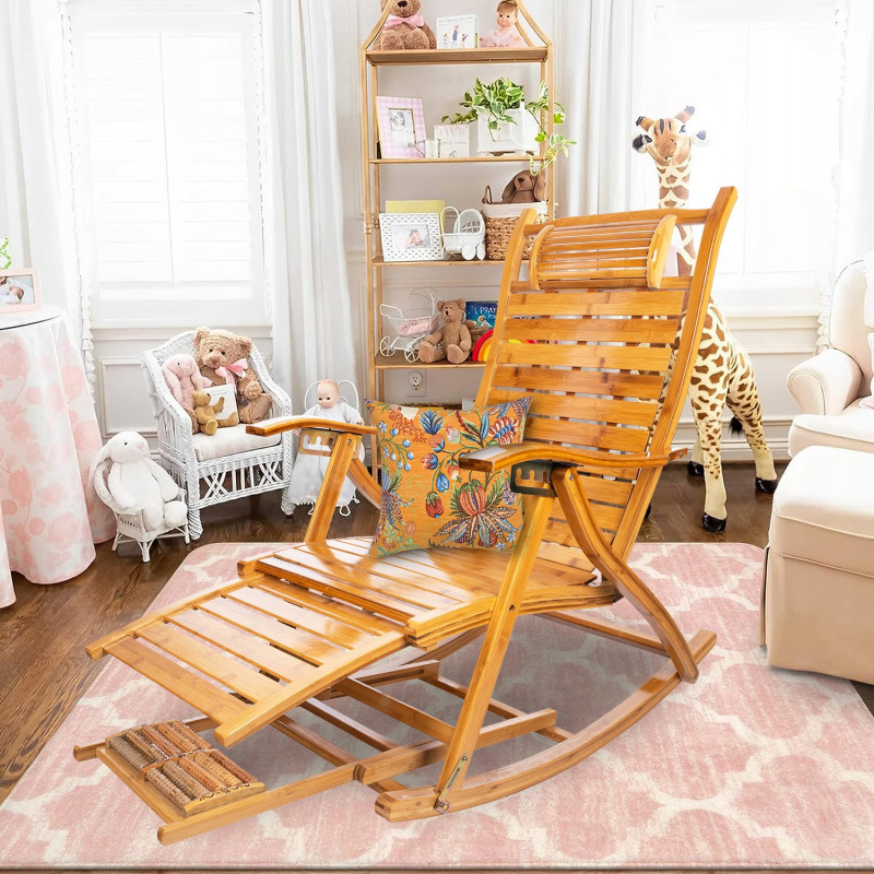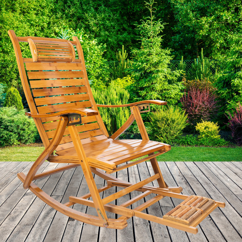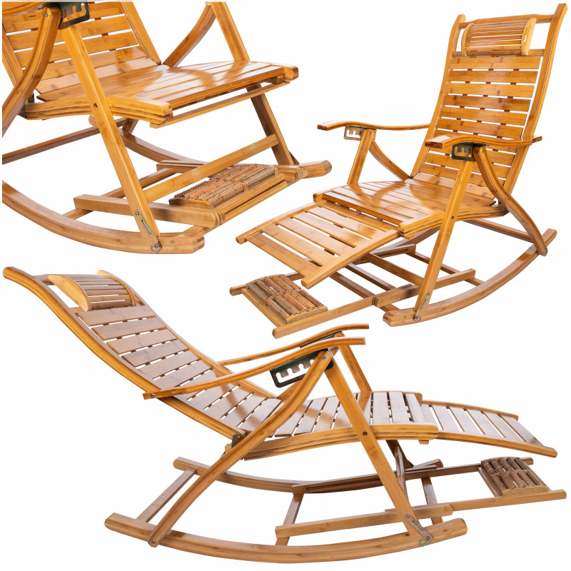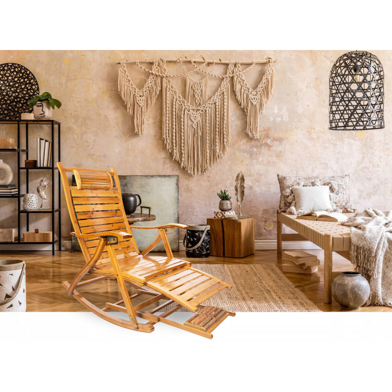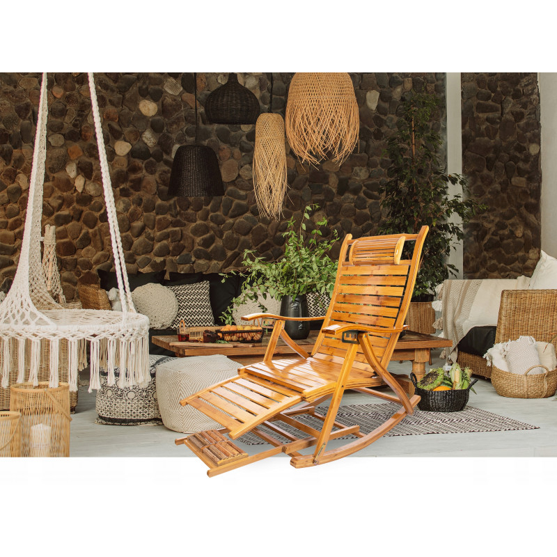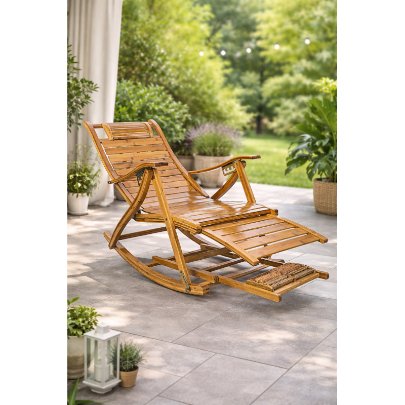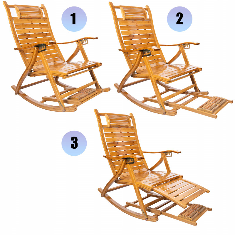 Scurta descriere Fotoliul balansoar multifunctional este conceput pentru relaxare completa si sustinere optima a corpului. Structura din bambus permite ajustarea in 5 pozitii, de la sezut la culcat, reducand presiunea asupra coloanei si relaxand musculatura. Include si functie de masaj pentru talpi, oferind un plus de confort si relaxare dupa o zi obositoare. Ideal pentru momente de odihna acasa sau pe terasa.