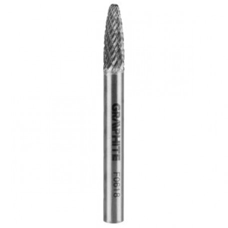 Freza rotativa din carbura HM GRAPHITE (ref. 55H369) tip F (rotunjita cu varf ascutit) de dimensiuni 6 x 18 mm este o unealta de slefuit dreapta pentru taierea sau limarea suprafetelor pieselor de prelucrat. Acesta este conceput pentru lucrul in materiale precum metalul, aluminiul si materialele plastice. Utilizarea carburii sinterizate confera sculei o duritate ridicata si rezistenta la uzura abraziva. Freza este prevazuta cu taiere dubla, ceea ce permite indepartarea usoara a aschiilor din piesa de prelucrat.