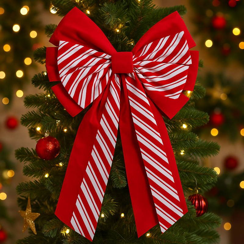 Scurta descriere: Fundita decorativa de Craciun in dungi rosii si albe aduce un aer vesel si traditional decorului de sarbatoare. Realizata din materiale rezistente si moi, este ideala pentru brad, usi, ferestre sau ambalaje de cadouri, oferind o nota clasica si festiva.