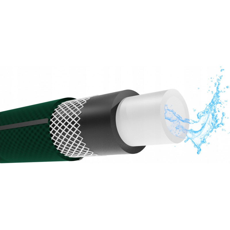 Rezistent la conditiile meteorologice - radiatii solare UV Furtunul de gradina de 30 m este format din 4 straturi din PVC flexibil pe baza de suspensie de clorura de polivinil, tereftalat si alte componente, intarite suplimentar cu impletitura textila.Produsul este conceput pentru a pompa apa la o presiune de lucru de 8 bar (la 20°C), presiunea de spargere este peste 24 bar (la 20°C). Interval de temperatura de la -10°C la +60°C.Rezistent la indoire, rasucire si innodare. Posibilitatea de utilizare pe termen lung datorita durabilitatii ridicate. Recomandat pentru utilizare frecventa intr-o gradina cu o structura precum gazon sau placa de piatra. De ce merita?