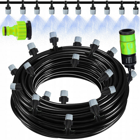 Date tehnice: Lungime: 10m Conector pentru robinet - 1x Teava neagra din PVC 15m -1x Conector rapid-1x Duza de pulverizare-7x Duza de pulverizare finala- 1xclema- 10x Perdeaua de vapori este ideala pentru zilele calduroase pe terase, balcoane sau atasata la umbrelele de gradina. Atunci cand este conectata la o sursa de apa, o ceata fina si racoritoare este pulverizata de la duze pentru a racori imprejurimile cu aproximativ 5-10°C. In plus, respinge insectele de toate felurile. Apa de la duze se scurge incet, ceea ce nu duce la utilizarea unei cantitati prea mari de apa si, prin urmare, nu creeaza pete umede sau daune datorita intensitatii sale moderate. Astfel, este usor si economic sa va bucurati de o racire placuta.Perdeaua poate fi instalata in aer liber. Locurile ideale pentru a o atasa sunt o umbrela de gradina, o marchiza, o pergola etc. In plus, acest produs poate fi utilizat in tuneluri si sere. Cu siguranta va functiona bine atat in gradinile mici, cat si in cele mari. Puteti atasa cu usurinta furtunurile cu duza la umbrela de gradina, terasa si balcon cu ajutorul clemelor de furtun incluse. Acestea faciliteaza fixarea pe suprafetele pe care le alegeti.Unghiul de pozitie al duzelor poate fi ajustat in functie de nevoile dvs. Nu este necesara nicio scurgere pentru a instala perdeaua, deoarece apa se evapora spontan, fara a crea daune sau pete umede. Totul poate fi conectat la un furtun de gradina obisnuit prin intermediul adaptorului rapid inclus.