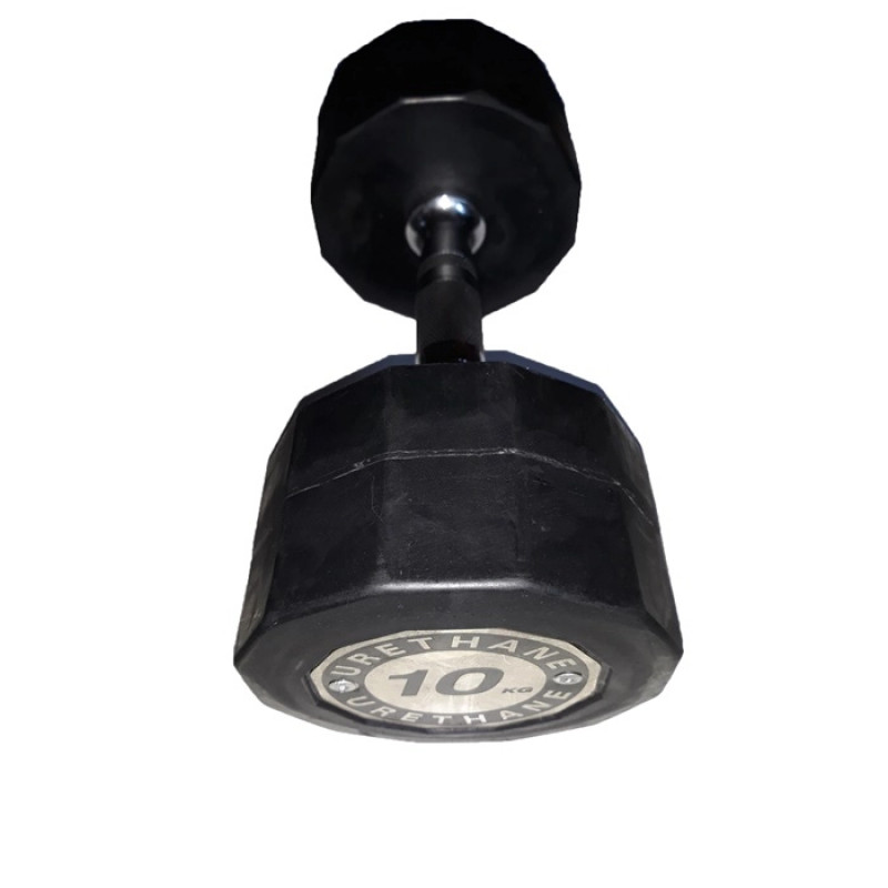 Gantera hexagonala realizata din poliuretan, are o durata de rezistenta mai mare decat cea realizata din cauciuc. Ganterele de acest tip sunt rezistente la umiditate, antiderapante si protejeaza podeaua la impactul cu aceasta. Forma hexagonala ofera o mai mare stabilitate si permite o depozitare usoara pe suport. Manerul cromat, ergonomic, este prevazut cu striatii antialunecare, pentru o aderenta mai buna.Greutati disponibile: 2.5, 5, 7.5, 10, 12.5, 15, 17.5, 20, 22.5, 25, 27.5, 30, 32.5, 35, 37.5, 40, 42.5, 45, 47.5, 50. Servesc nevoilor unui incepator, dar si exigentelor unui sportiv de performanta in ceea ce priveste eficienta antrenamentelor.Pretul este pe bucata.Producator: Dayu Fitness