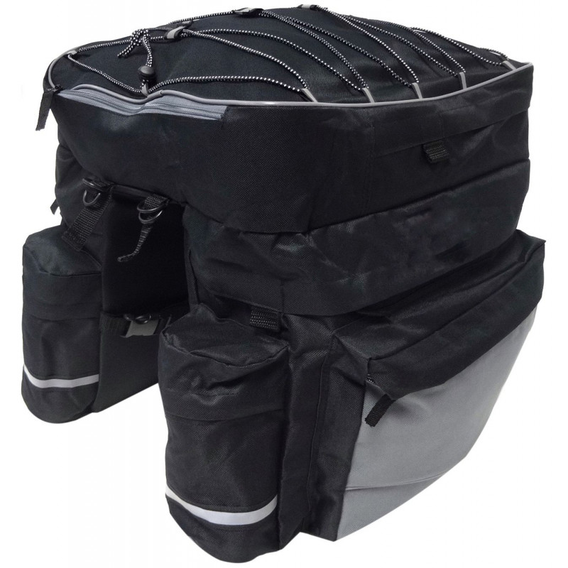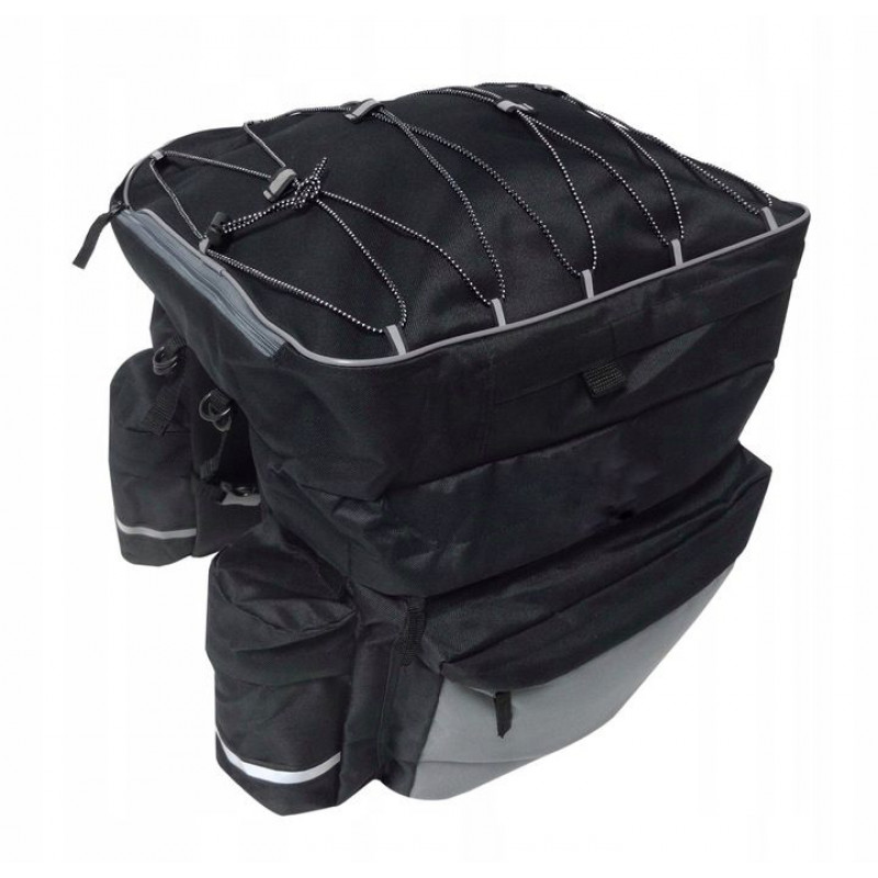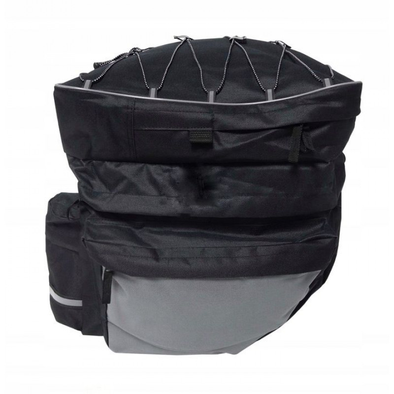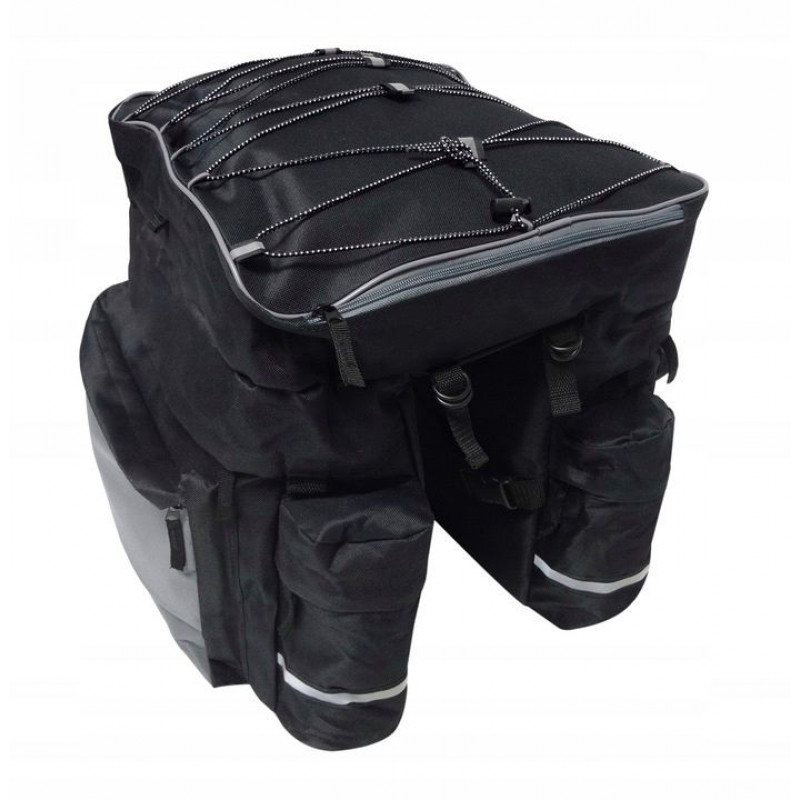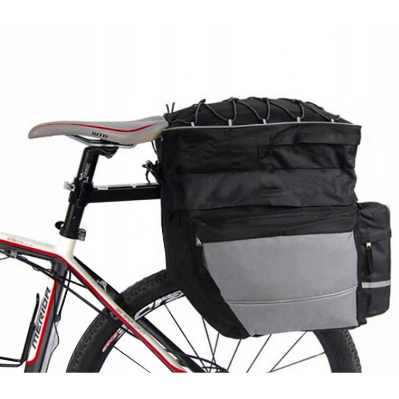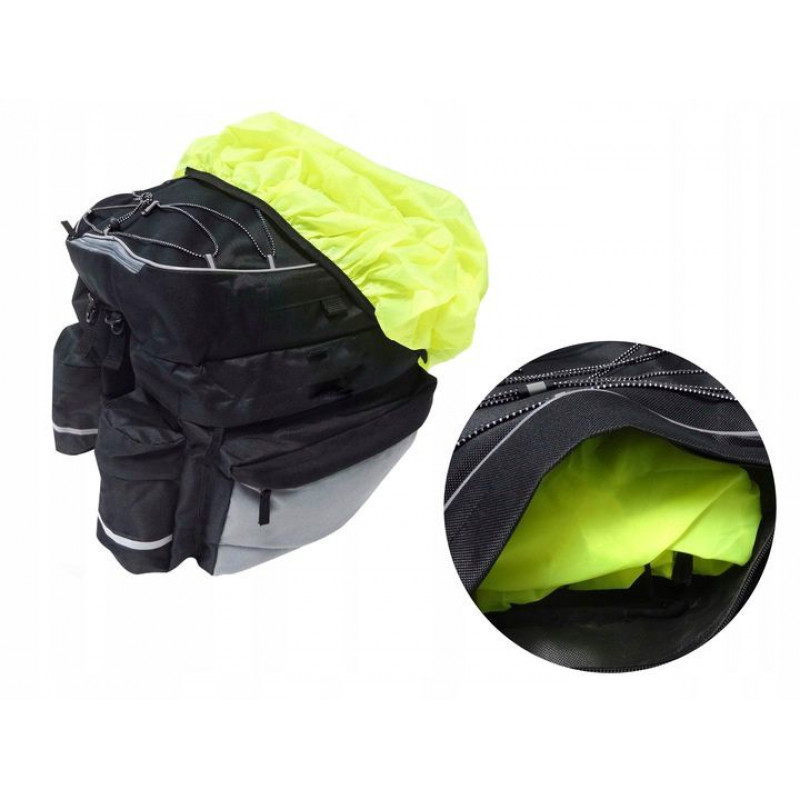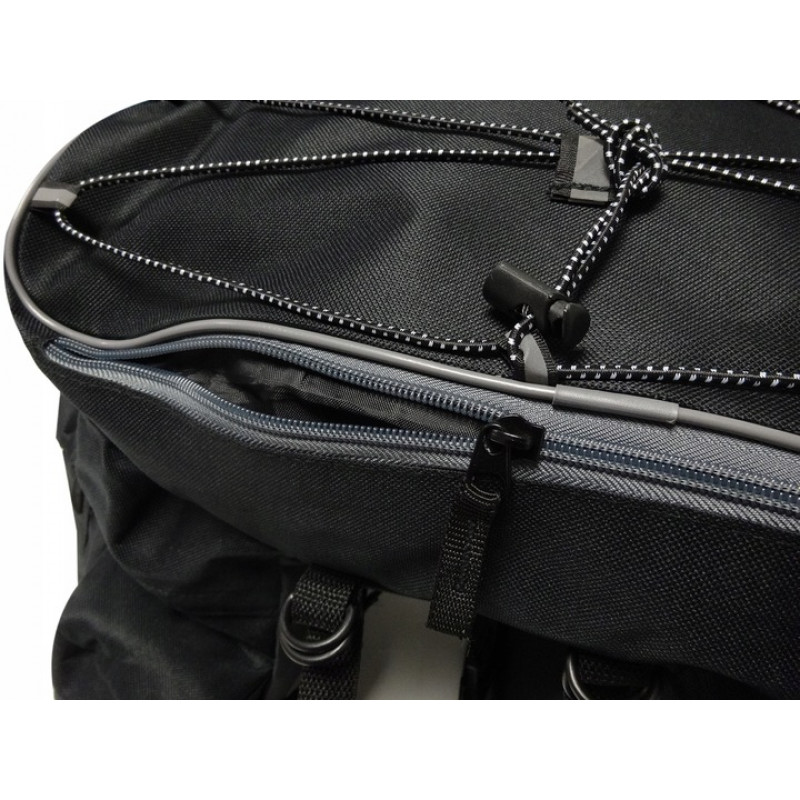 Geanta impermeabila inclusa Rucsacul de bicicleta este o solutie ideala pentru utilizarea zilnica si pentru calatoriile mai lungi de weekend. Datorita faptului ca este extrem de spatioas, va gazdui toate lucrurile de care aveti nevoie in timpul unei excursii pe bicicleta, cum ar fi: sac de dormit, cort, haine si pantofi de schimb, cosmetice, unelte, alimente, etc. Are un total de 8 buzunare si, in partea de sus a sacosei, elastice cu snururi pentru incarcaturi mari. Acest lucru ofera posibilitati mari de ambalare. Se ataseaza cu curele si catarame la suportul de bagaje, ceea ce inseamna ca se potriveste la orice suport, iar timpul de montare este extrem de rapid si fara probleme. Geanta este rezistenta la stropire, iar in cazul unei ploi, exista un compartiment special cu un capac impermeabil care poate fi tras peste geanta pentru a proteja si mai mult continutul. Compartimentele se inchid cu fermoare si exista elemente reflectorizante in jurul gentii pentru o siguranta sporita pe timp de noapte. Partile laterale ale sacosei intarite si rigidizate, fermoare decente (protejate de material impotriva prafului si a murdariei), material rigid.
