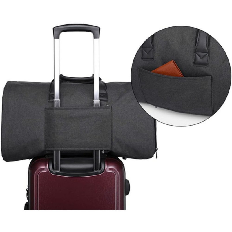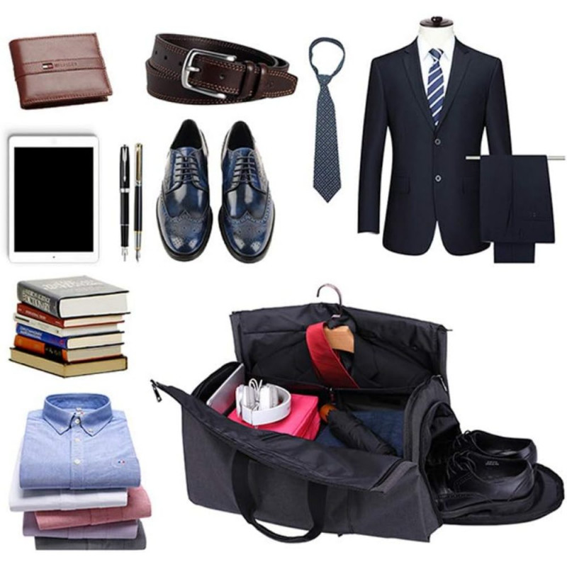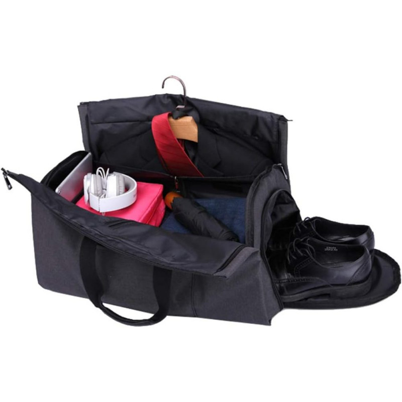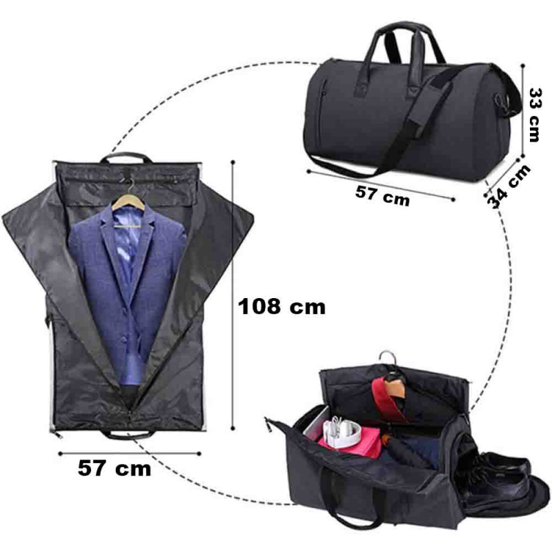 Pe langa costum si incaltaminte, poti transporta si accesoriile de care ai nevoie, geanta fiind suficient de spatioasa cu multe compartimente si buzunare. Toate aceste elemente sunt armate suplimentar cu mai multe cusaturi. Aceasta geanta se poate purta pe umar in mana sau pe spate in forma de rucsac. Are 2 manere largi pentru transportul in mana, 1 bareta detasabila pentru transportul pe umar, ajustabila 85 – 140 cm si 2 barete late, pentru a fi purtata in spate ca rucsac, baretele pot fi ascunse intr-un buzunar din spate in cazul cand doriti sa purtati geanta in mana sau pe umar.