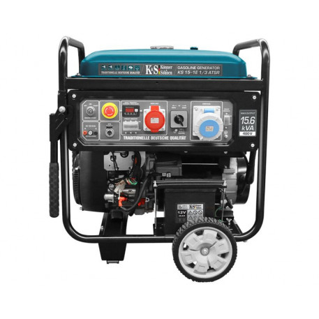 Generatorul de benzină KS 15-1E 1/3 ATSR de înaltă performanță se bazează pe un motor cu doi cilindri de 22 CP de la „Könner & Söhnen” care îndeplinește toate standardele europene de calitate, inclusiv cele mai recente standarde de emisii EURO 5. Acest generator este potrivit pentru conectarea unei unități ATS și are un sistem unic de comutare a fazelor VTS, care permite utilizarea generatorului atât în modul monofazat (230 V) cât și în modul trifazat (400 V) fără pierderi de putere aproape deloc. Un panou de control ergonomic ușor de utilizat cu un buton de oprire de urgență a motorului și un afișaj LED multifuncțional permite monitorizarea funcționării generatorului: tensiune, frecvență, orele de funcționare, precum și nivelul uleiului. Acest model este echipat cu prize pentru scoaterea completă a puterii de către generator. Prizele sunt echipate cu siguranțe și completate cu fișe adecvate. Rezervorul de combustibil de mare capacitate de 55 l asigură o funcționare îndelungată și continuă.
