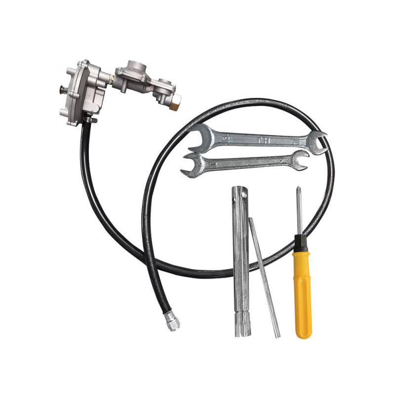 2. Furtunul este echipat cu un reductor care este montat la butelie pentru a crește fiabilitatea conductei de gaz. Astfel se reduce presiunea și se elimină posibilitatea supraîncărcării racordului la gaz. Doar conectați generatorul la butelie și porniți motorul.