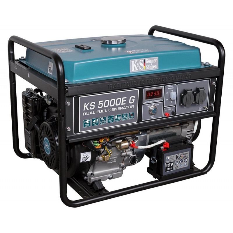 Generatoarele pe benzină și gaz lichefiat Könner & Söhnen din seria DUAL FUEL sunt printre cele mai apreciate de cumpărători datorită eficienței economice și impactului ecologic redus. Aceste generatoare pot funcționa atât cu benzină, cât și cu gaz lichefiat (propan-butan), iar utilizarea gazului contribuie la prelungirea duratei de viață a motorului. Toate accesoriile necesare pentru conectarea buteliei sunt incluse în set: generatorul este echipat cu un regulator de presiune zero și un furtun cu reductor de presiune. Pentru utilizare, este suficient să conectați generatorul la butelia de gaz. Generatorul nu este destinat racordării la rețeaua de gaz. Dacă este necesar, modelele pe gaz și benzină pot fi comutate ușor pe funcționarea cu benzină. Motorul monocilindric, în patru timpi, marca K&S, cu răcire pe aer, asigură o funcționare stabilă și fiabilă a generatorului.