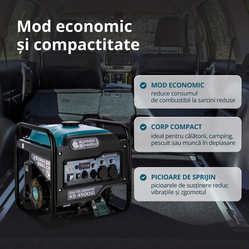 Generatorul inverter KS 4500iG (4,2 kW benzină, 3,8 kW gaz) oferă energie stabilă pentru echipamente medicale, laboratoare, servere și sisteme de stocare. Tehnologia inverter garantează undă sinusoidală pură – sigură pentru electronice sensibile. Funcționează cu benzină sau GPL, reducând costurile și emisiile. Include furtun de gaz de 1,5 m și reductor. Dotat cu motor K&S (EURO V), afișaj LED, prize 16A, 12V, USB QC 3.0, Type-C. Mod ECO pentru eficiență energetică. Compact, ușor de transportat – ideal pentru camping, pescuit, drumeții și situații de urgență.