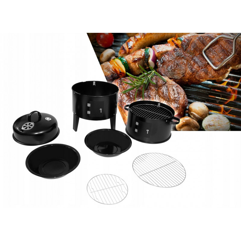 Diametru gratare: 37,5 cm Constructia solida, utilizarea materialelor de inalta calitate, inclusiv: o grosime semnificativa a tablei - aproximativ 1 mm, determina siguranta si durata de viata lunga a gratarului. Rezistenta la temperaturi ridicate si conditii meteorologice. Dimensiunea potrivita a gratarului garanteaza un gratar placut oriunde! Dispozitivul este format din 3 parti asamblate impreuna. Elementul inferior cu picioare si vatra poate fi combinat cu capacul fara elementul central.
