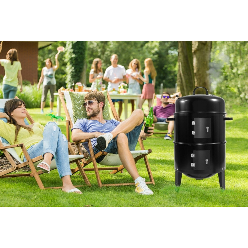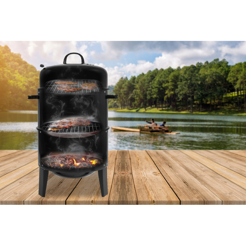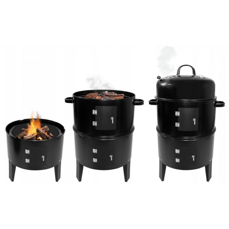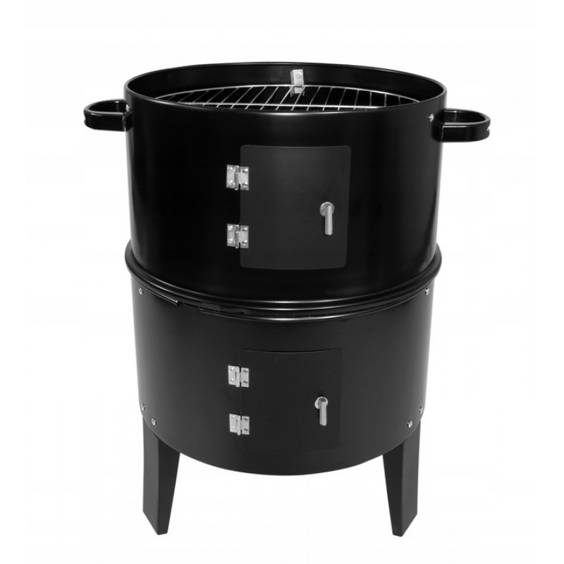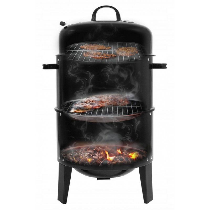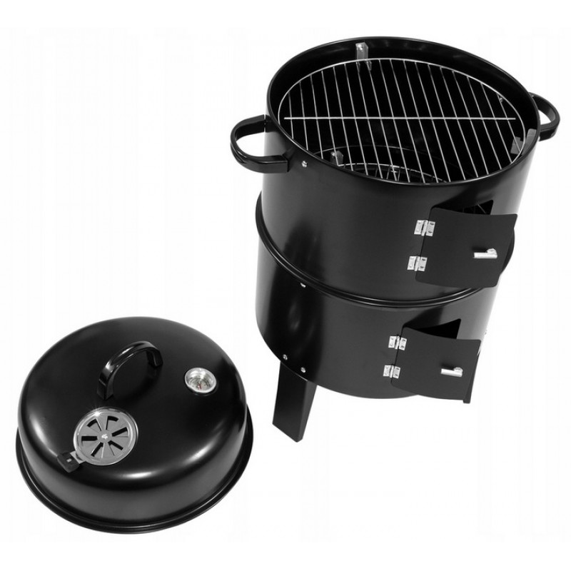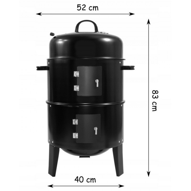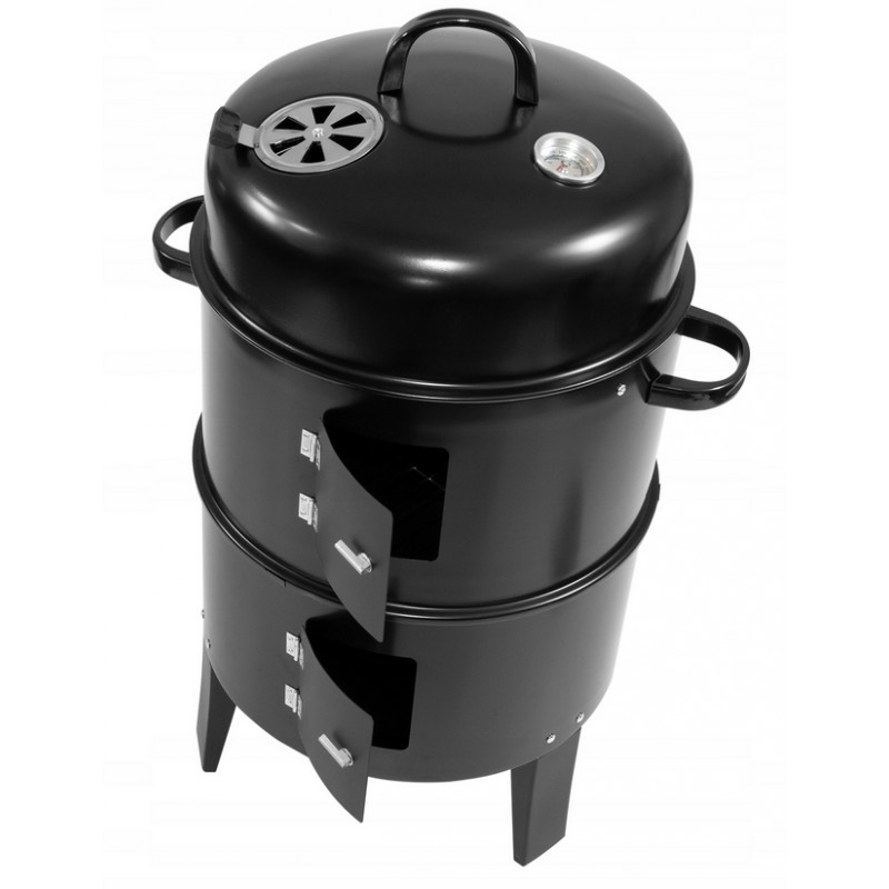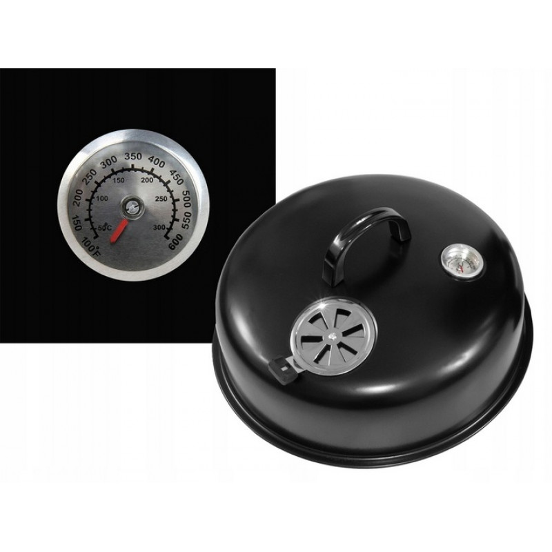 Doua usi pentru un acces mai usor in interiorul afumatorii. Capacul regleaza perfect temperatura, suprima focul si permite alimentelor sa se coaca mai mult timp la o temperatura mai scazuta. Datorita acestei proceduri, alimentele nu sunt arse la exterior, si sunt gatite uniform.Reglarea suplimentara a temperaturii se realizeaza folosind orificiile de ventilatie situate in capac. Husa serveste si ca protectie impotriva ploii si a prafului suflat de vant.Gratarul este echipat cu un termometru pentru controlul temperaturii interioare.
