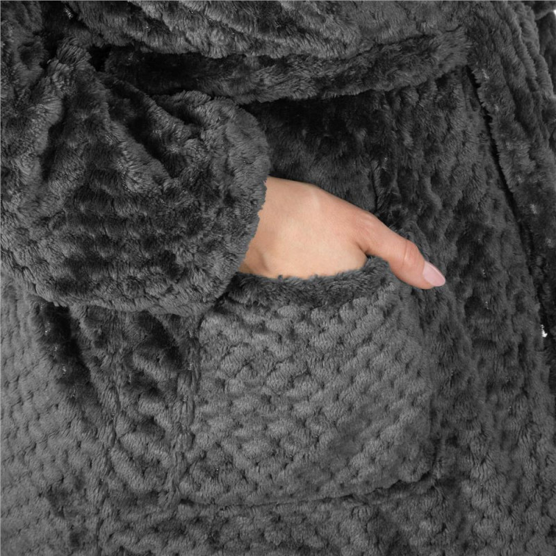 Ridicarea dispozitiei – purtarea halatului nostru de baie va poate ajuta sa va imbunatatiti starea de spirit, oferind un sentiment de placere. Halatul nostru de baie nu numai ca va va fermeca prin aspectul sau placut, dar va va oferi si o functionalitate nepretuita. Cu o gluga care adauga o nota eleganta si buzunare frontale practice, veti avea intotdeauna loc pentru telefon, telecomanda sau obiecte mici.. In plus, este prevazut cu o curea practica in talie, permitand o potrivire perfecta.Halatul de baie va deveni partea preferata a ritualului tau zilnic de relaxare. Asortati-l cu ceaiul sau cartea preferata si simtiti cum fiecare zi devine putin mai speciala.