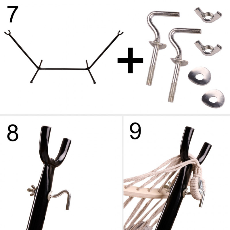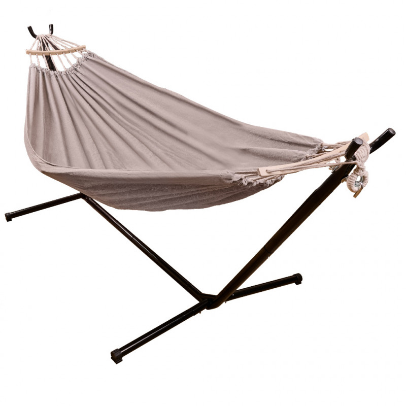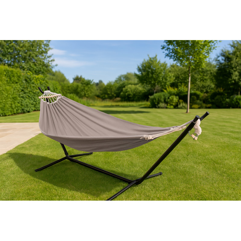 Scurta descriere: Ideal pentru relaxare in aer liber, hamacul cu suport metalic este solutia perfecta pentru curte, terasa sau camping. Cu structura robusta si material confortabil, ofera stabilitate si usurinta in montare, fiind perfect pentru utilizare individuala. Datorita inaltimii reglabile si dracusului din lemn, hamacul este confortabil si sigur pentru toate varstele.