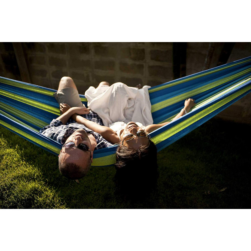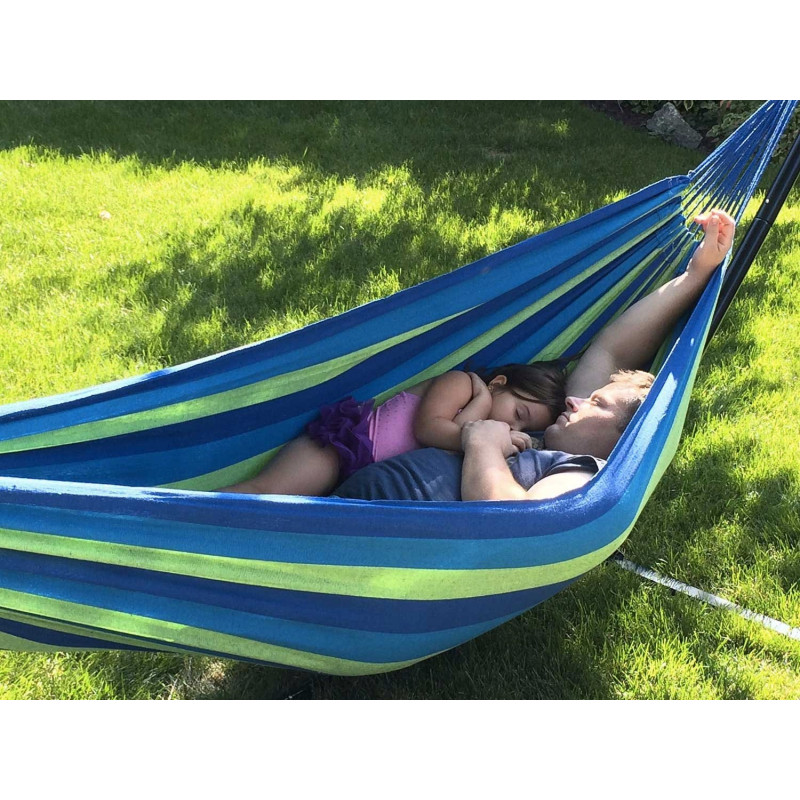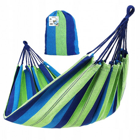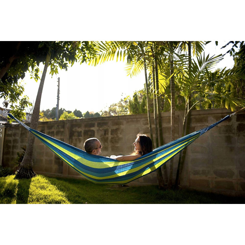 Un hamac de gradina mare si confortabil. Datorita suprafetei mari, doua persoane se pot intinde pe hamac. Un hamac este o piesa de mobilier unica care, mai presus de toate, ar trebui sa fie confortabila si durabila. Potrivirea perfecta a materialului de inalta calitate este cea care ne va invalui corpul si ne va oferi un sentiment de siguranta in timp ce ne odihnim. Un hamac de gradina este lucrul perfect pentru toti cei carora le place sa-si petreaca timpul liber in sanul naturii. Doar legati cele doua capete ale hamacului de copaci sau stalpi robusti si bucurati-va de confort. Puteti, de exemplu, sa cititi o carte in timp ce va leganati usor intr-un hamac moale.