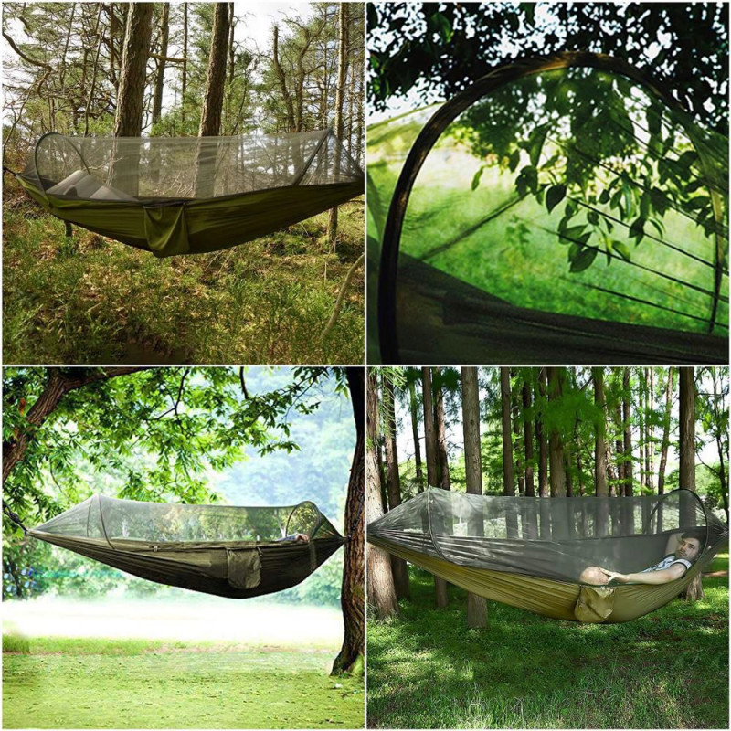 Idee perfecta de cadou Principalul avantaj al hamacului nostru este plasa de tantari montata, care ofera o protectie fiabila impotriva insectelor si gandacilor. Datorita acesteia, va puteti bucura de un somn linistit si de relaxare fara a va face griji cu privire la muscaturi sau mancarimi ale pielii. Plasa de tantari este confectionata din plasa fina si usoara, care nu restrictioneaza fluxul de aer, oferind in acelasi timp o bariera de protectie eficienta. Hamacul de drumetie este extrem de practic si usor de utilizat. Acesta poate fi desfasurat si pliat cu usurinta intr-o forma compacta, fiind ideal pentru a fi luat in deplasare. Sunt incluse curele de prindere solide si carlige de prindere, ceea ce va permite sa atarnati hamacul practic oriunde - de la copacii din padure la suporturile de pe plaja. De asemenea, poate fi transportat cu usurinta cu o geanta speciala pentru confort si protectie in timpul calatoriilor.