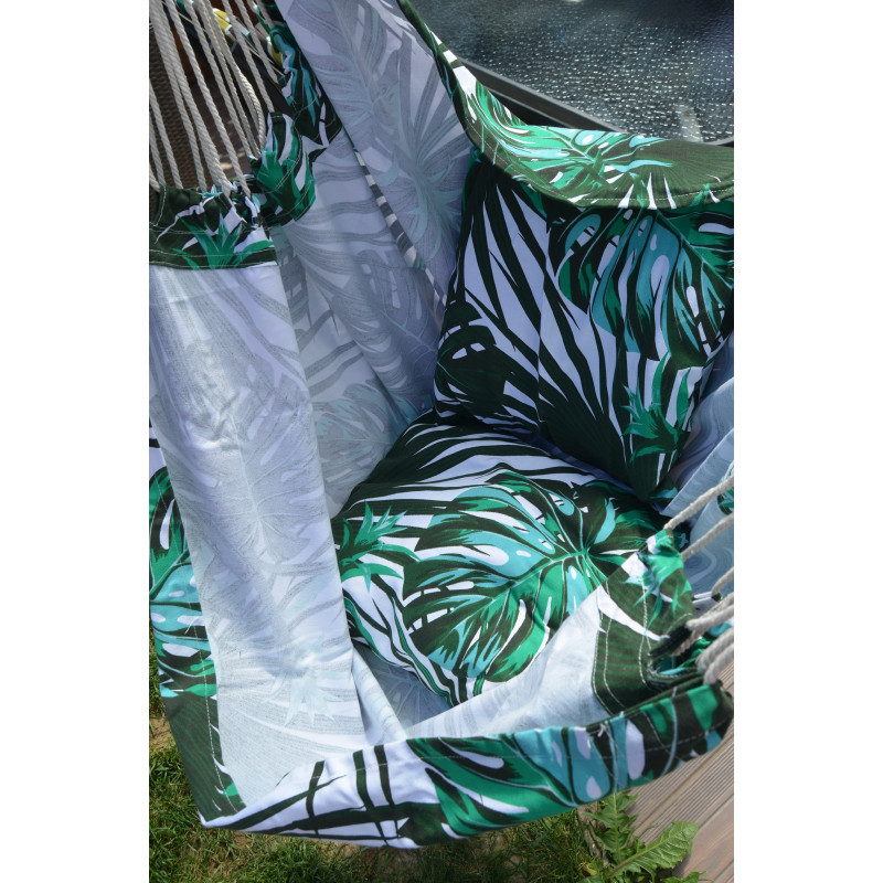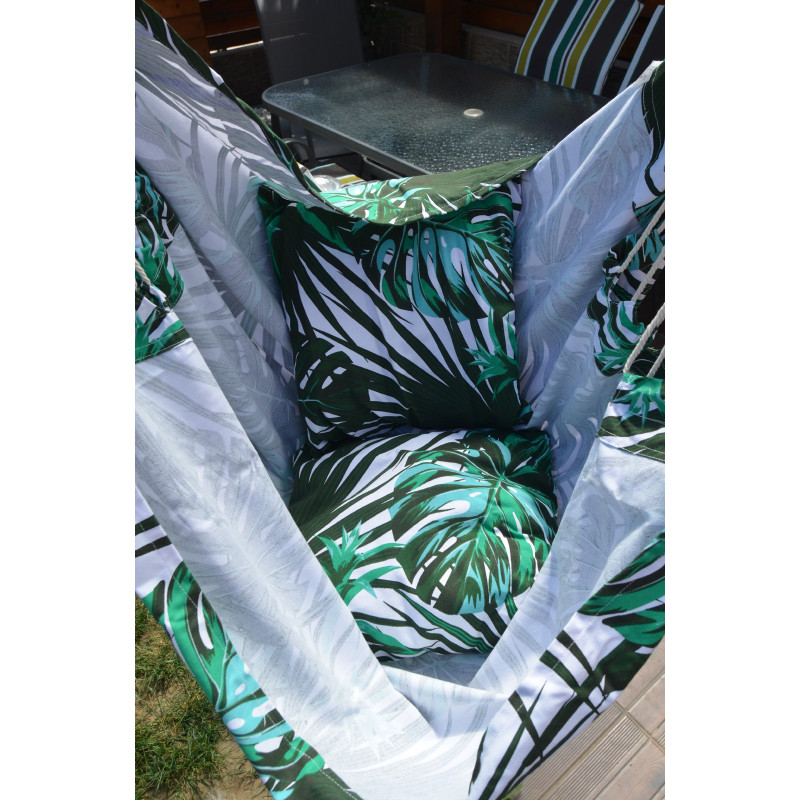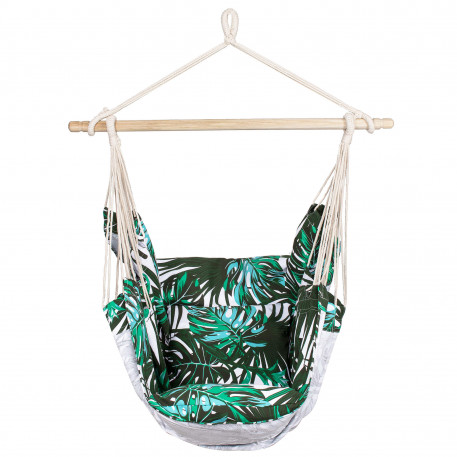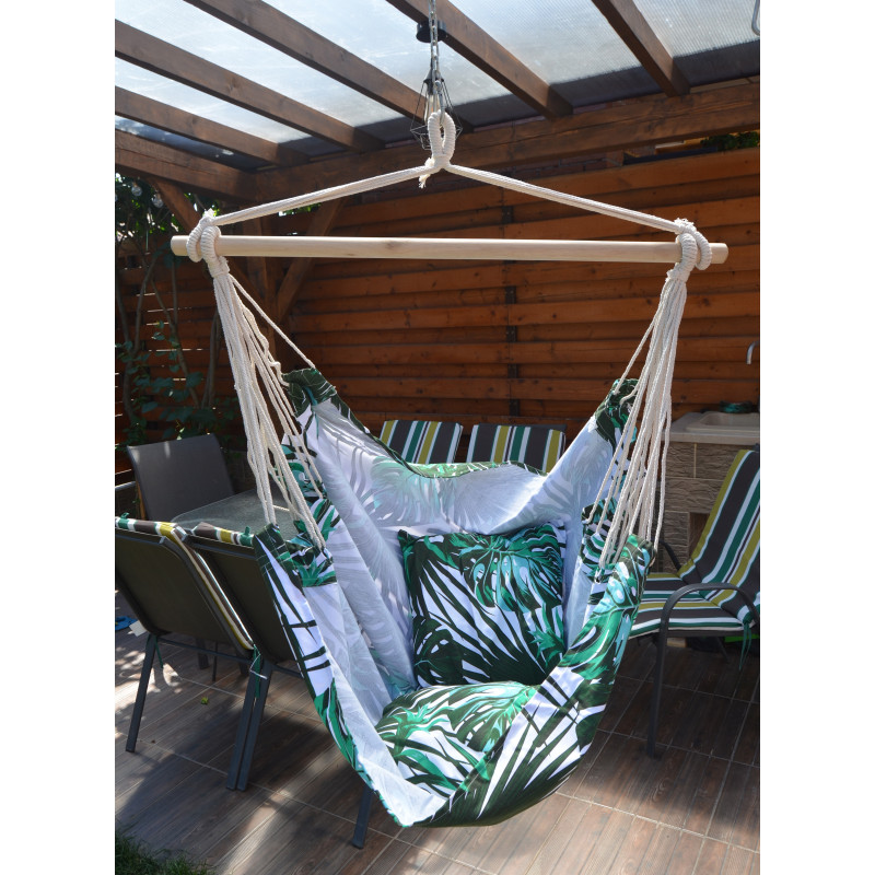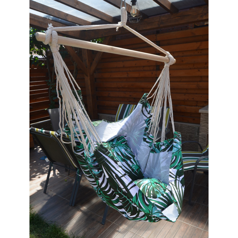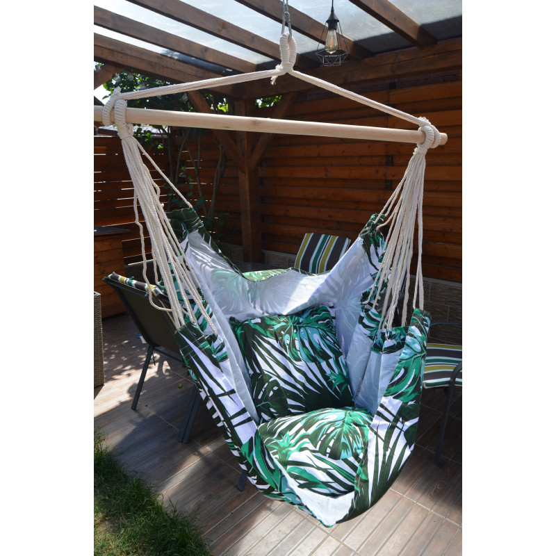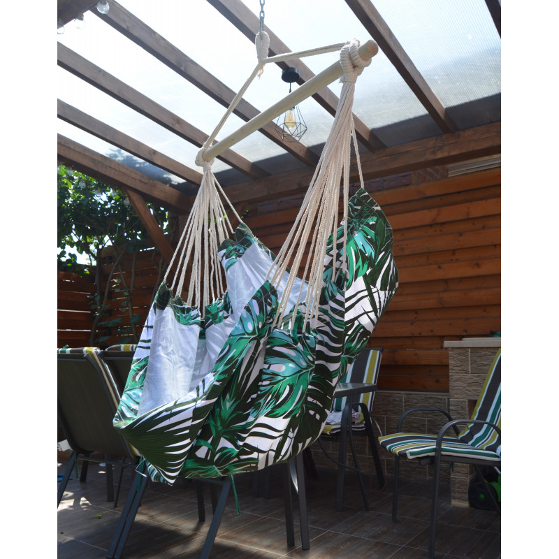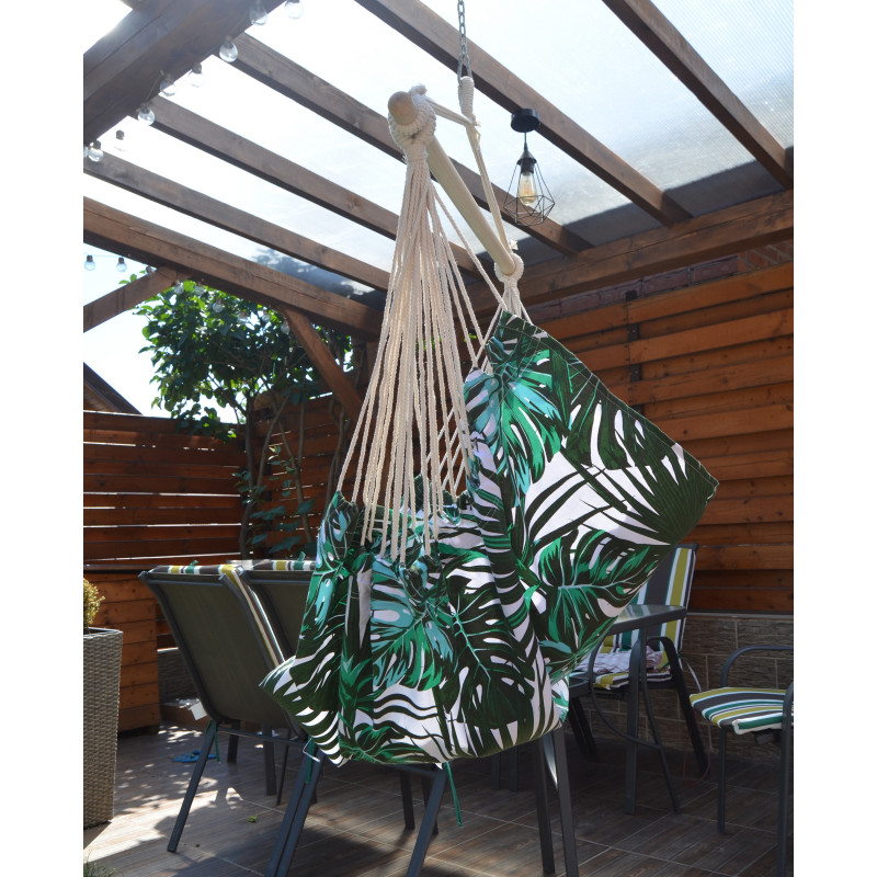 Scaun tip leagan suspendat pentru casa sau gradina, floral, 130x100cm, 150kg, bumbac + poliester Petreceti zilele calduroase de vara la umbra intr-un hamac tip scaun. Trebuie doar agatat in gradina, terasa sau ramurile unui copac si te poti bucura de odihna si aer curat.Materialul special captusit asigura confort si suport suplimentar, iar bara de sustinere din lemn care sustine franghiile este prevazuta cu un inel care faciliteaza suspendarea acestuia. Dupa plierea scaunului acesta ocupa putin spatiu putand fi luat cu usurinta oriunde.Hamacul poate fi folosit atat de copii cat si de adulti.