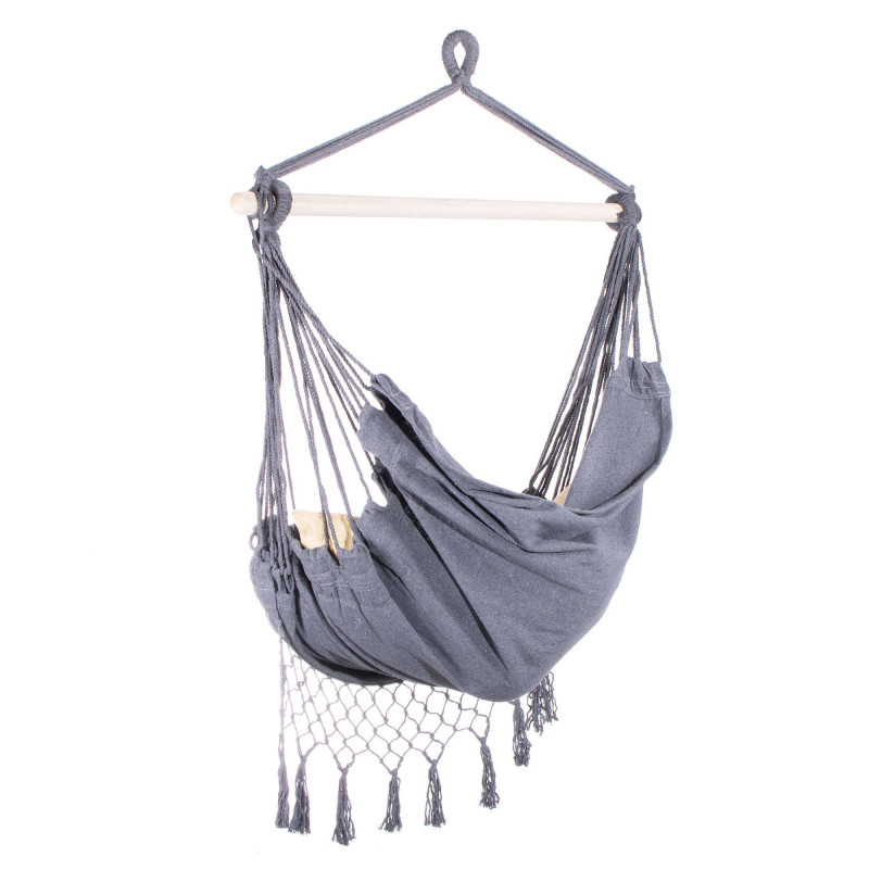 Petreceti zilele calduroase de vara la umbra intr-un hamac tip scaun. Trebuie doar agatat in gradina, terasa sau ramurile unui copac si te poti bucura de odihna si aer curat.Materialul special captusit asigura confort si suport suplimentar, iar bara de sustinere din lemn care sustine franghiile este prevazuta cu un inel care faciliteaza suspendarea acestuia. Dupa plierea scaunului acesta ocupa putin spatiu putand fi luat cu usurinta oriunde.Hamacul poate fi folosit atat de copii cat si de adulti.