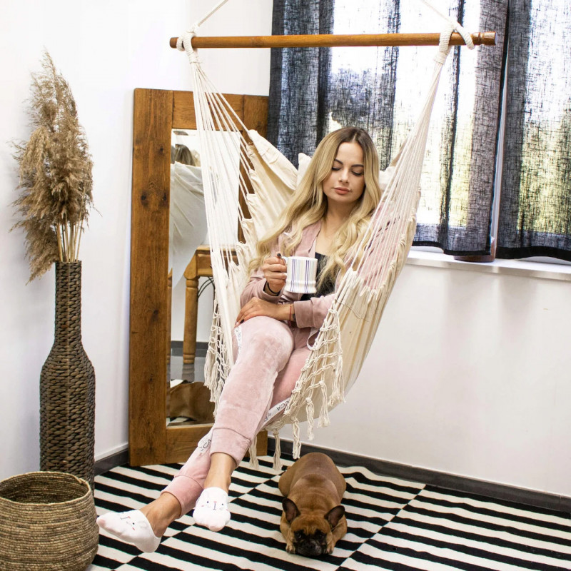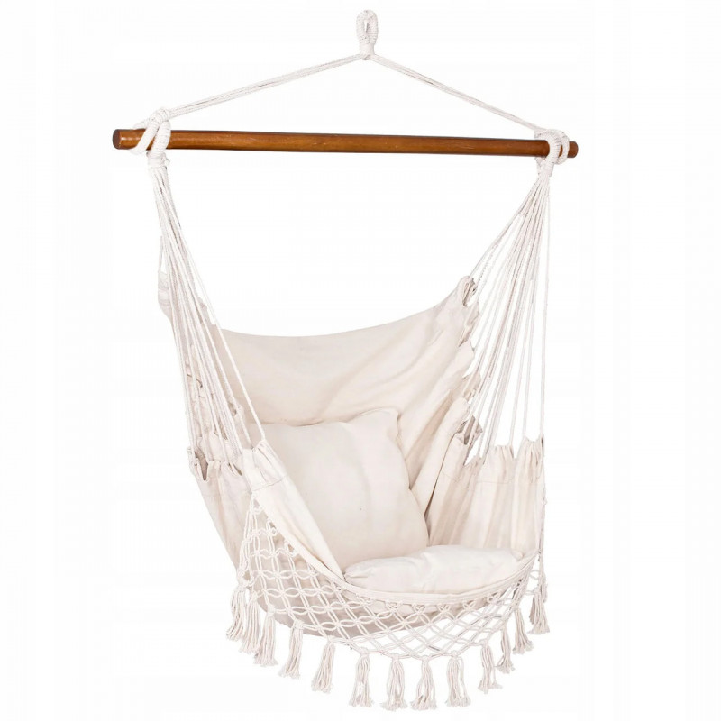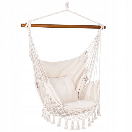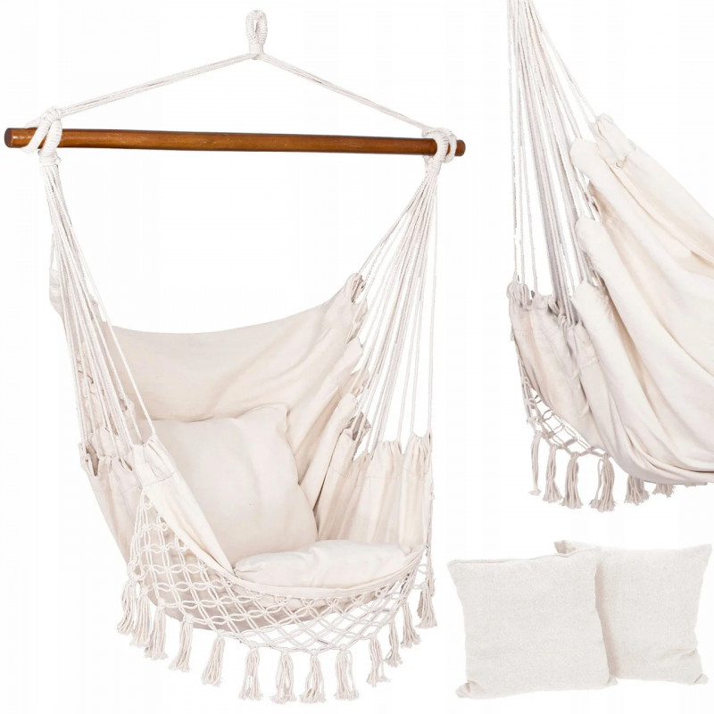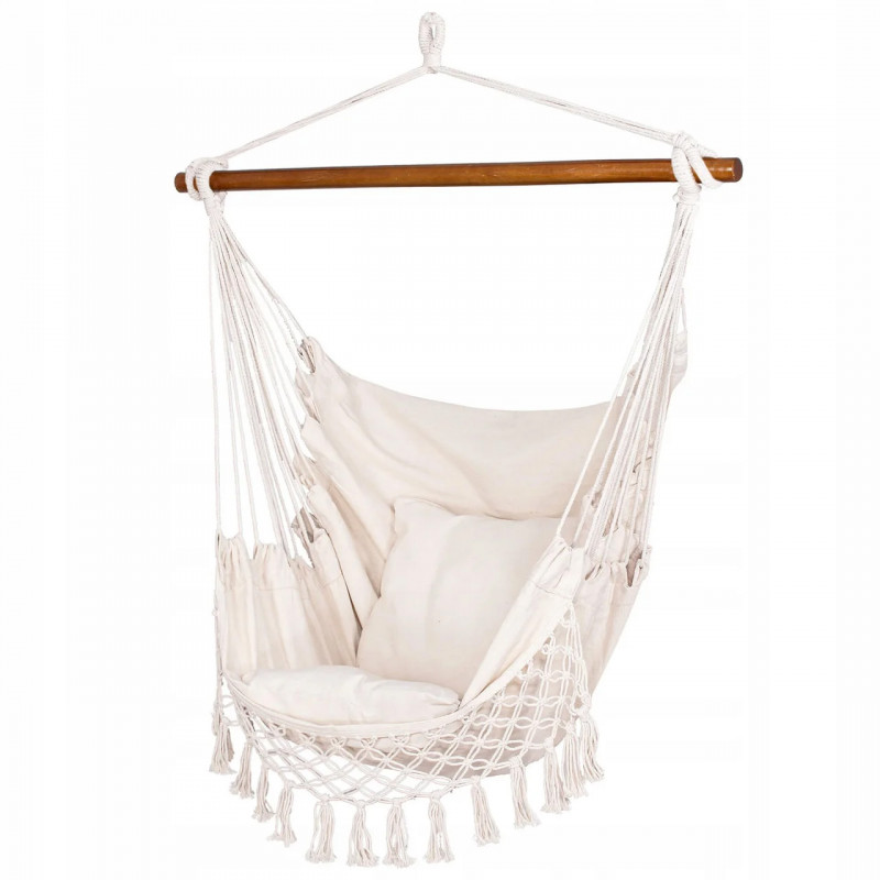 Hamac brazilian tip scaun, cu 2 perne, crem, max 150 kg, 130x100 cm Hamacele braziliene se caracterizeaza prin calitatea materialului si manopera atenta.Pernele incluse in set completeaza perfect intregul produs, datorita caruia ne putem odihni in aer liber sau in interior in confort deplin.Fabricat din materiale naturale, inclusiv bumbac, asigura o permeabilitate maxima la aer si o calitate ridicata a produsului.Materialul usor si foarte durabil se adapteaza la corp, astfel incat balansarea pe el este confortabila si sigura.Hamacul are bucla pentru agatat, care va permite sa alegeti individual unde sa il agatati.Dupa pliere, ocupa putin spatiu, iar greutatea maxima permisa de utilizare este de 150 kg.