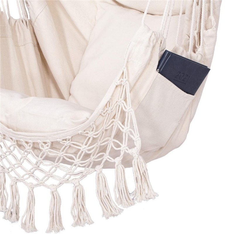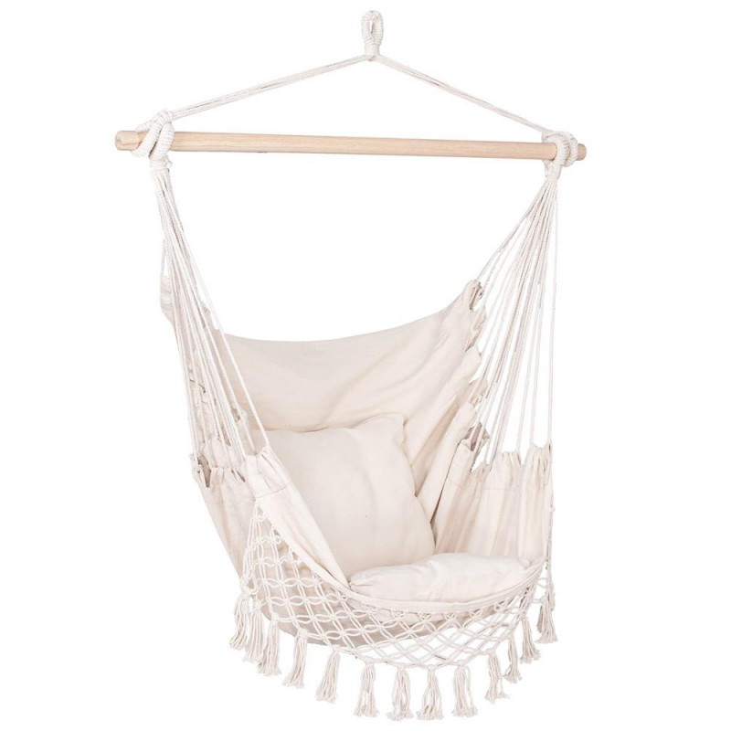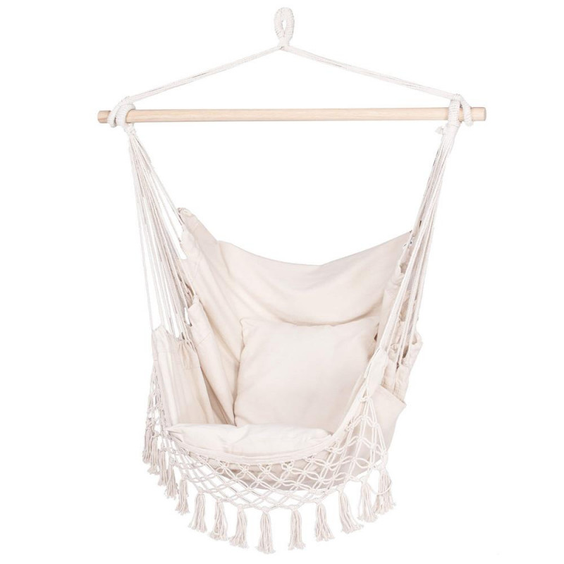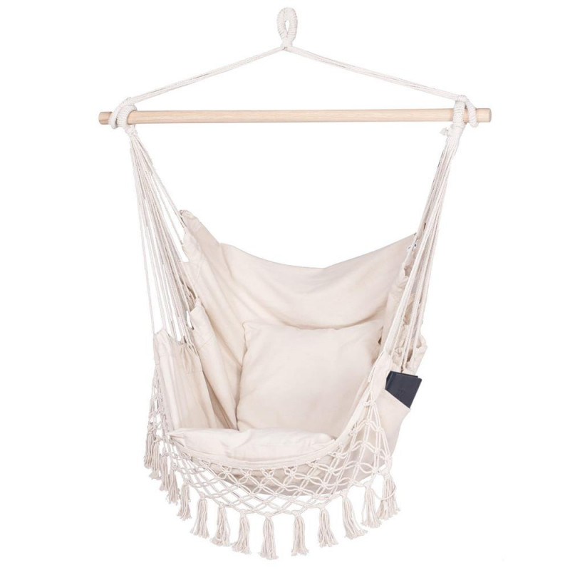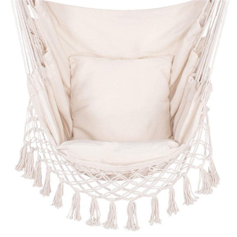 Hamac brazilian tip scaun, cu 2 perne, crem, max 150 kg, 130x100 cm Hamacele braziliene se caracterizeaza prin calitatea materialului si manopera atenta.Pernele incluse in set completeaza perfect intregul produs, datorita caruia ne putem odihni in aer liber sau in interior in confort deplin.Fabricat din materiale naturale, inclusiv bumbac, asigura o permeabilitate maxima la aer si o calitate ridicata a produsului.Materialul usor si foarte durabil se adapteaza la corp, astfel incat balansarea pe el este confortabila si sigura.Hamacul are bucla pentru agatat, care va permite sa alegeti individual unde sa il agatati.Dupa pliere, ocupa putin spatiu, iar greutatea maxima permisa de utilizare este de 150 kg.