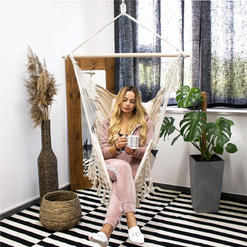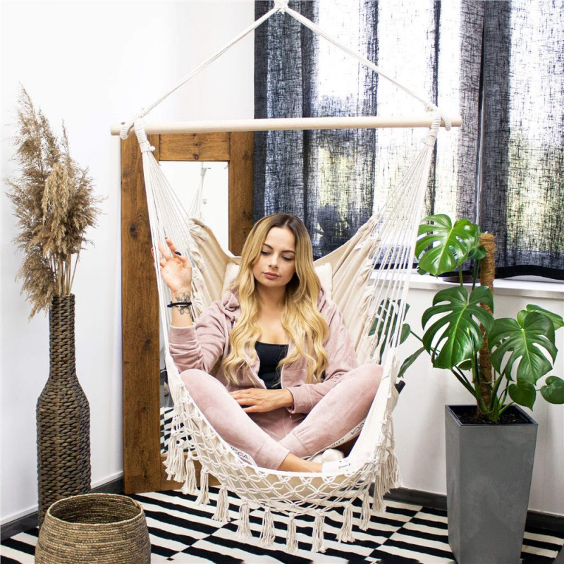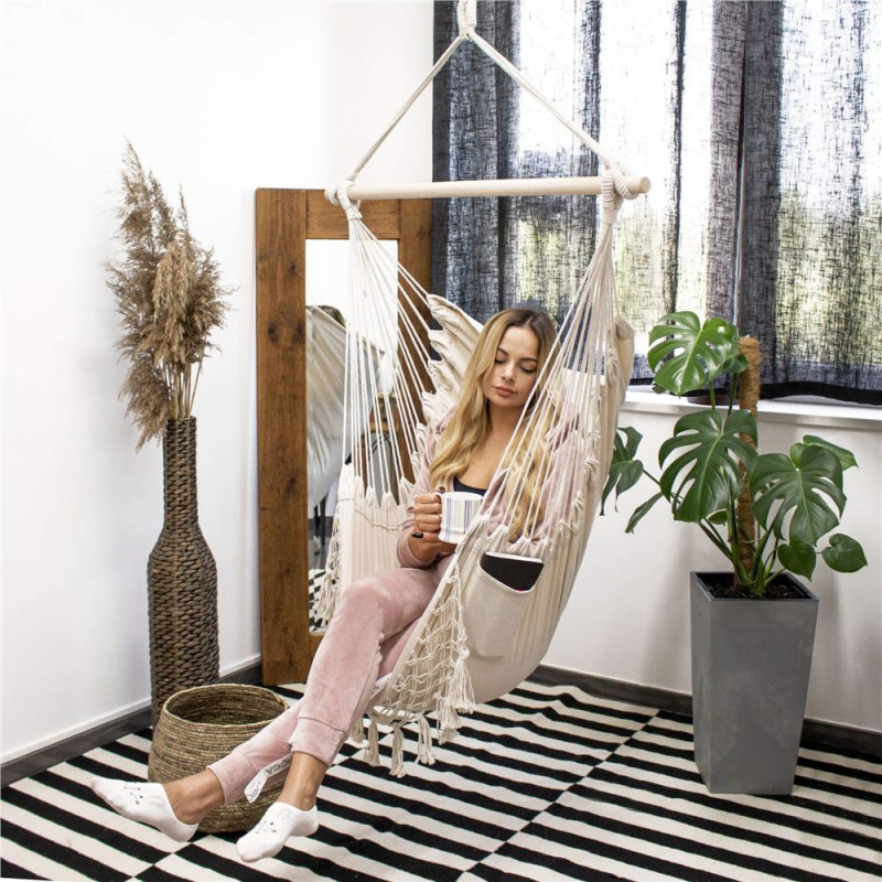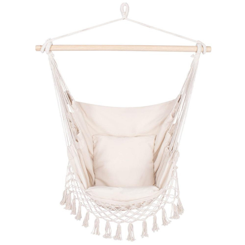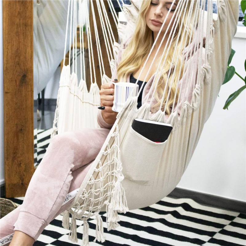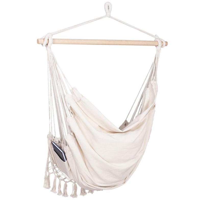 Hamac brazilian tip scaun, cu 2 perne, crem, max 150 kg, 130x100 cm Hamacele braziliene se caracterizeaza prin calitatea materialului si manopera atenta.Pernele incluse in set completeaza perfect intregul produs, datorita caruia ne putem odihni in aer liber sau in interior in confort deplin.Fabricat din materiale naturale, inclusiv bumbac, asigura o permeabilitate maxima la aer si o calitate ridicata a produsului.Materialul usor si foarte durabil se adapteaza la corp, astfel incat balansarea pe el este confortabila si sigura.Hamacul are bucla pentru agatat, care va permite sa alegeti individual unde sa il agatati.Dupa pliere, ocupa putin spatiu, iar greutatea maxima permisa de utilizare este de 150 kg.