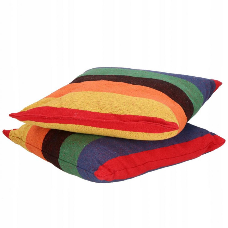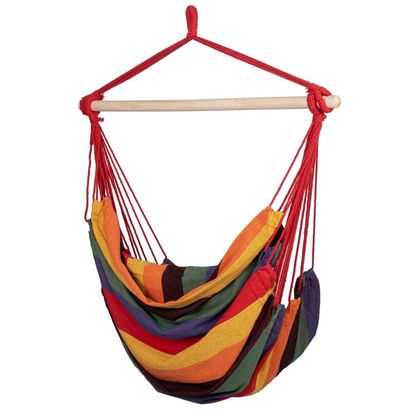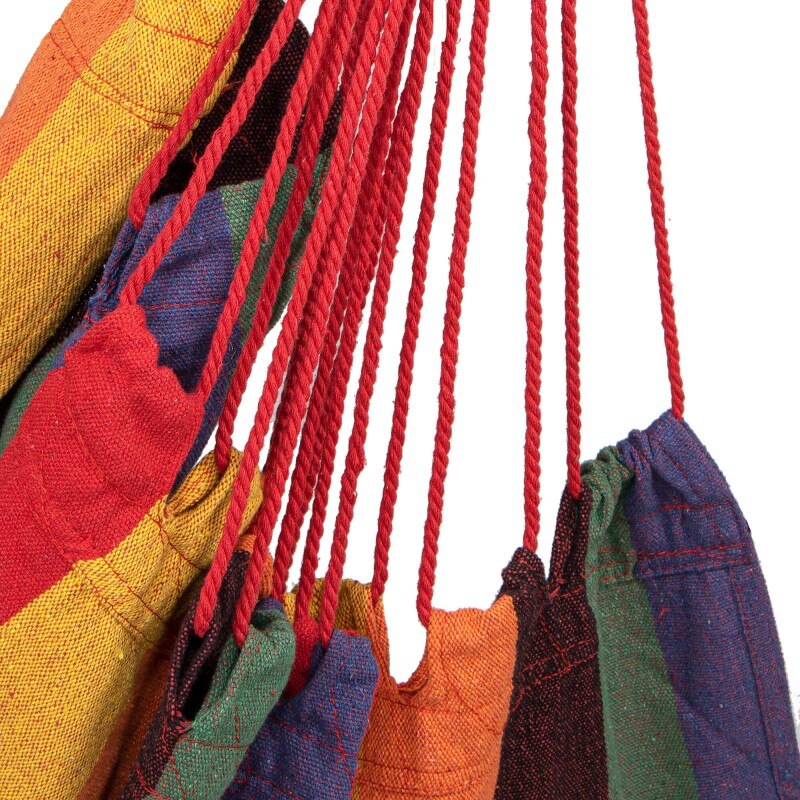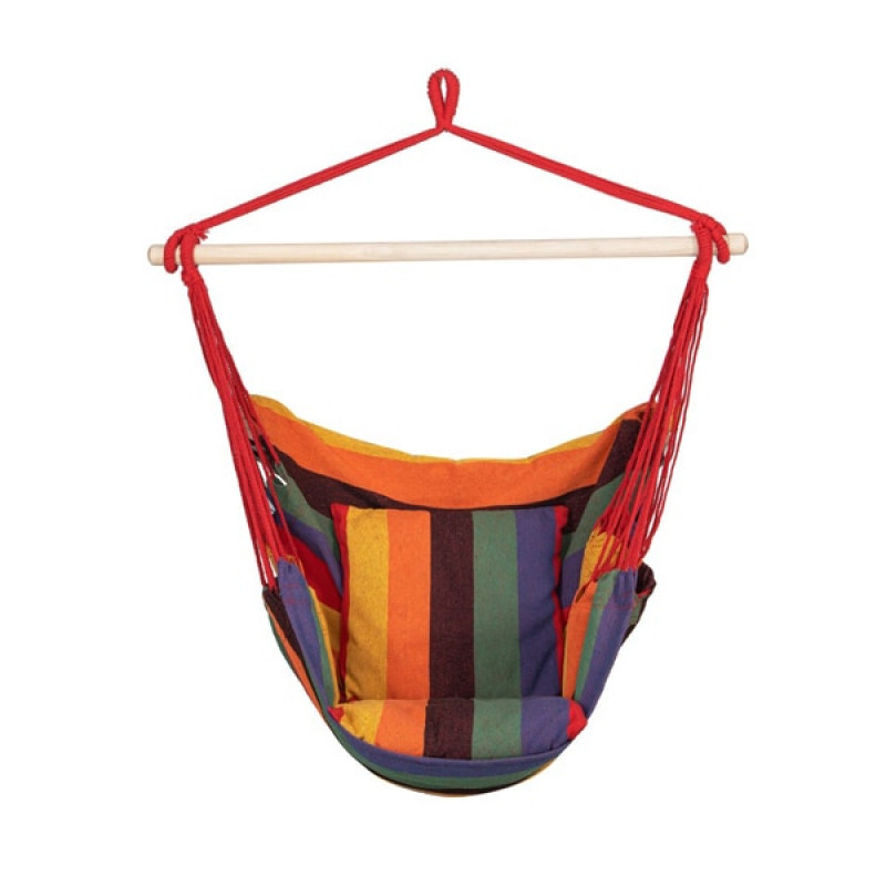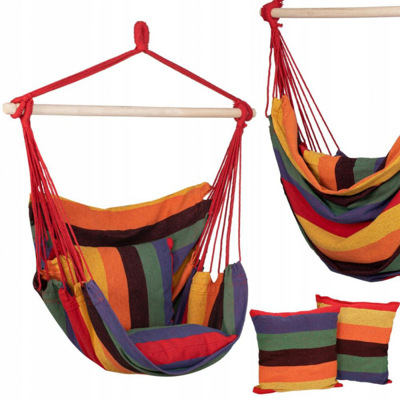 Hamac brazilian tip scaun, cu 2 perne, multicolor, max 150 kg, 130x100 cm Hamacele braziliene se caracterizeaza prin calitatea materialului si manopera atenta.Pernele incluse in set completeaza perfect intregul produs, datorita caruia ne putem odihni in aer liber sau in interior in confort deplin.Fabricat din materiale naturale, inclusiv bumbac, asigura o permeabilitate maxima la aer si o calitate ridicata a produsului.Materialul usor si foarte durabil se adapteaza la corp, astfel incat balansarea pe el este confortabila si sigura.Hamacul are bucla pentru agatat, care va permite sa alegeti individual unde sa il agatati.Dupa pliere, ocupa putin spatiu, iar greutatea maxima permisa de utilizare este de 150 kg.