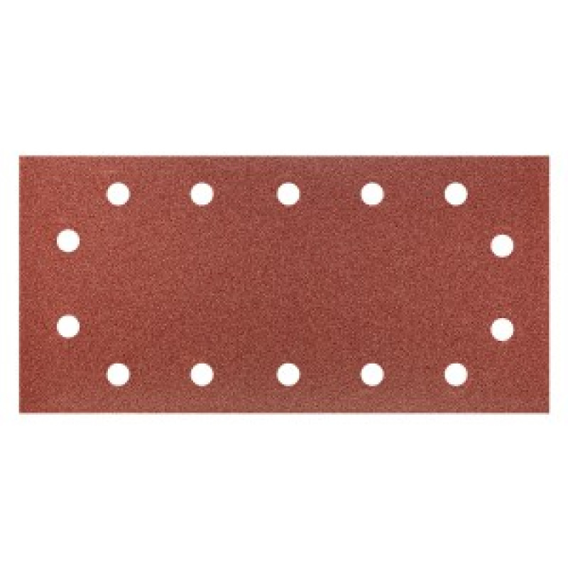 Hartie de slefuit GRAPHITE (ref. 55H723) 115 x 230 mm, gradatie 100, cu gauri. Dedicata slefuirii lemnului, a materialelor pe baza de lemn, a metalelor si a materialelor plastice. Hartia este fabricata din hartie de tip E pentru slefuirea masinilor si are o structura semi-deschisa cu o acoperire de 80-90% a granulelor abrazive (electrocorindon), ceea ce garanteaza o munca mai eficienta si reduce riscul de infundare. Fixarea de tip Velcro permite inlocuirea rapida a hartiei folosite. Produsul este conceput pentru a fi utilizat cu slefuitoarele orbitale. Marca GRAPHITE ofera o gama larga de scule electrice pentru a satisface nevoile profesionale.