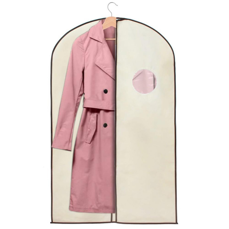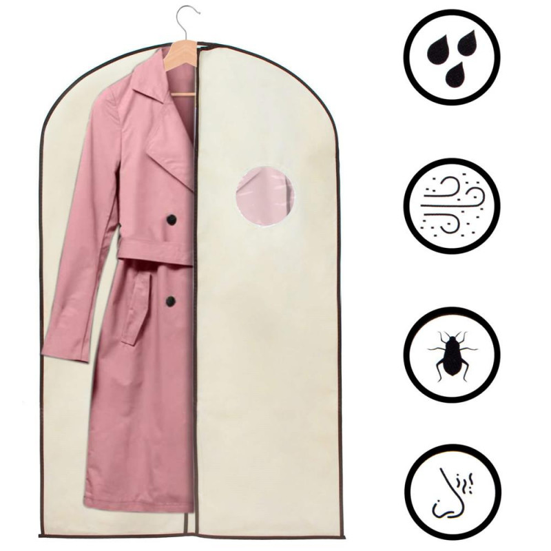 Fereastra transparenta care arata continutul Husa de haine este o solutie excelenta pentru calatorii. Imbracamintea ascunsa in interiorul produsului este protejata impotriva murdariei, pufurilor si a altor astfel de situatii nedorite. Bara de protectie este utila si pentru articolele depozitate in garderoba care se poarta pentru o ocazie speciala, precum costum, rochie sau camasa. Husa are o taietura speciala care permite mutarea cuierului. Accesul usor la continut se datoreaza fermoarului care trece prin centrul produsului.