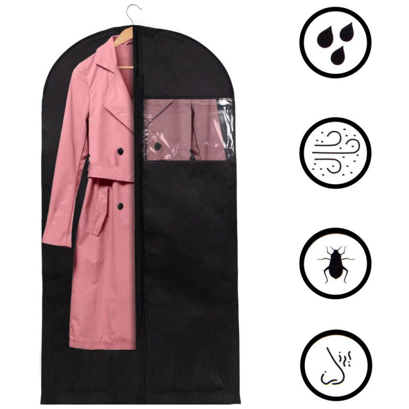 Husa de haine este o solutie excelenta pentru calatorii. Imbracamintea ascunsa in interiorul produsului este protejata impotriva murdariei, pufurilor si a altor astfel de situatii nedorite. Bara de protectie este utila si pentru articolele depozitate in garderoba care se poarta pentru o ocazie speciala, precum costum, rochie sau camasa. Husa are o taietura speciala care permite mutarea cuierului. Accesul usor la continut se datoreaza fermoarului care trece prin centrul produsului. Un avantaj suplimentar al produsului este si o fereastra transparenta care va permite sa vedeti continutul husei.