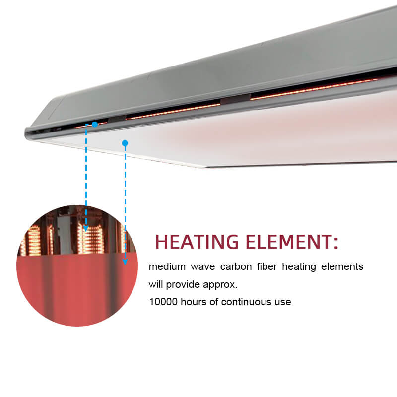 - Element de incalzire: elementele de incalzire din fibra de carbon cu unda medie vor asigura cca. 10000 de ore de utilizare continua.
