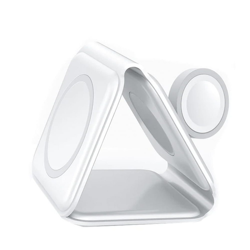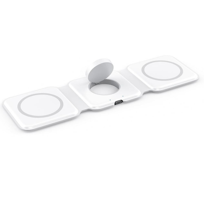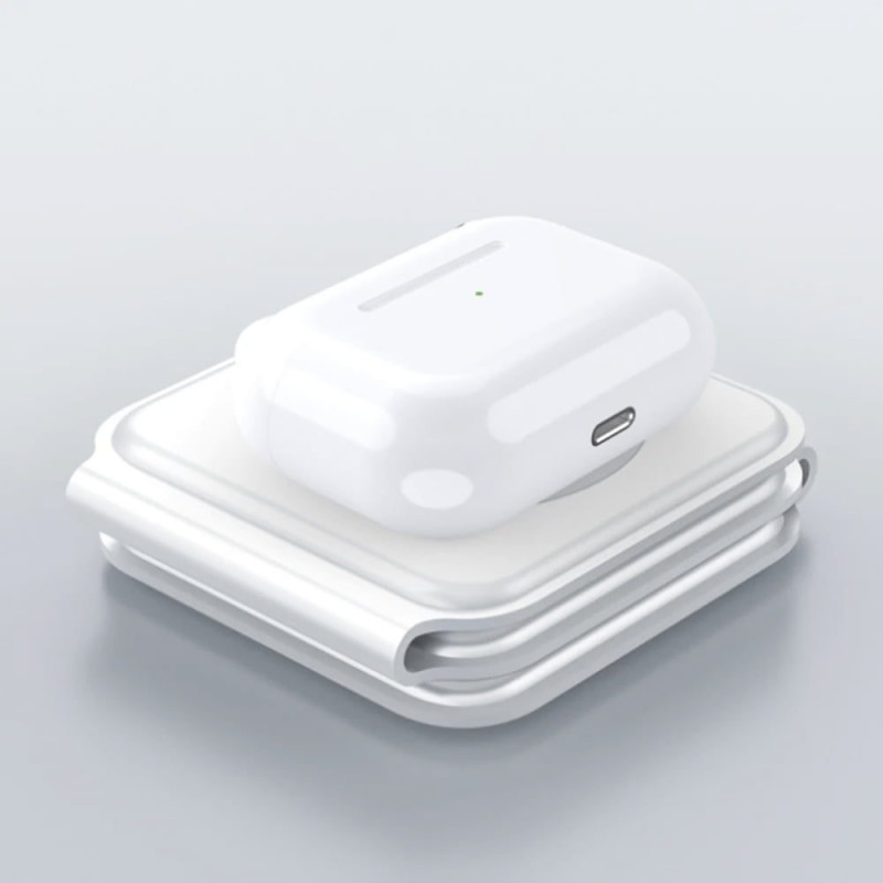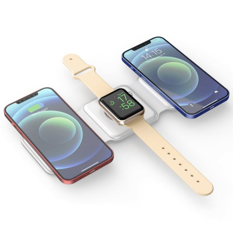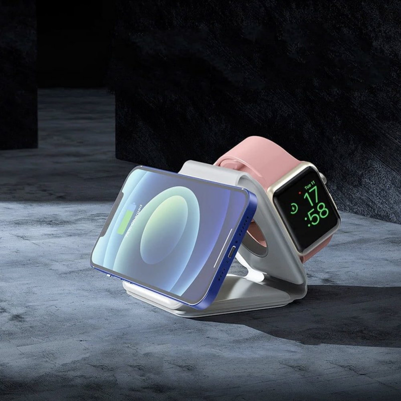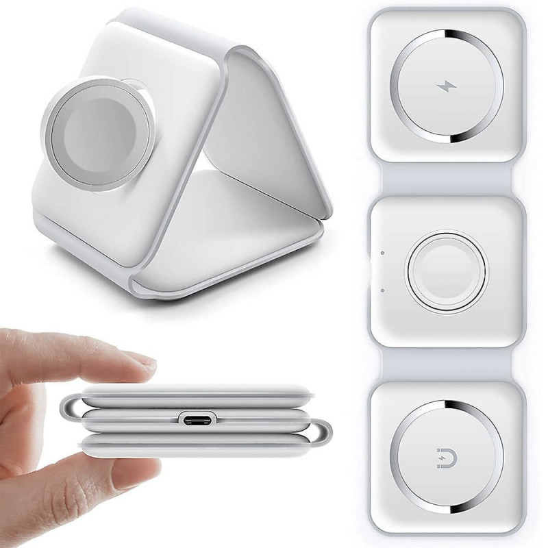 Standul multifunctional de incarcare wireless poate incarca telefoane mobile, ceasuri si casti wireless in acelasi timp. Compatibil cu iWatch 6/5/4/3/2/1. Design cu afisaj dual-light, starea de functionare este clara dintr-o privire, lumina albastra din dreapta este aprinsa, este starea de incarcare a castilor; lumina albastra din stanga este aprinsa, este starea de incarcare a telefonului. Iluminarea moale si ascunsa este perfecta pentru incarcarea telefonului atunci cand dormiti si nu vreti sa va deramjeze nicio lumina. Dupa ce incarcarea wireless a fost conectata la sursa de alimentare, trebuie doar sa plasati usor dispozitivul in mijlocul pozitiei corespunzatoare pentru a-l incarca. Materialul siliconic moale poate fi indoit si pliat in mod repetat. Cu design magnetic triunghiular, incarcatorul wireless poate fi pliat intr-un incarcator cu un singur dispozitiv care economiseste spatiu sau il puteti pune plat sau intr-un mod triunghiular in picioare pentru a incarca trei dispozitive in acelasi timp. Incarcatorul este subtire si compact, usor de transportat, foarte potrivit pentru acasa, birou, calatorii, vacanta etc.