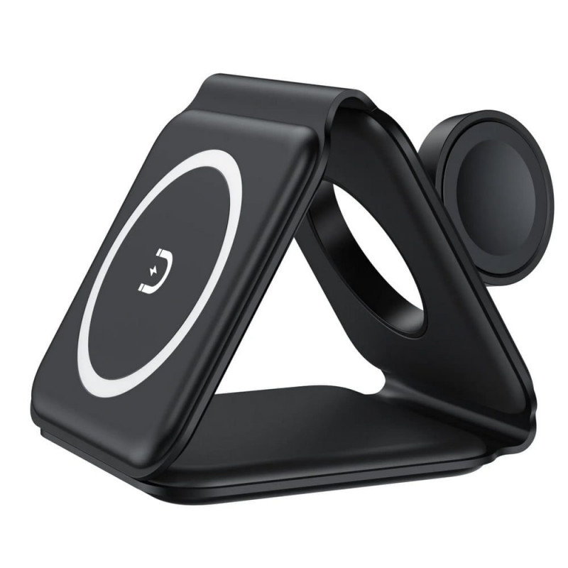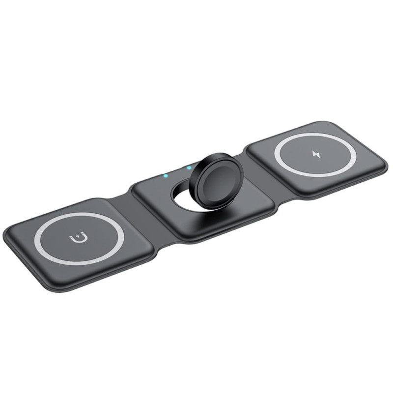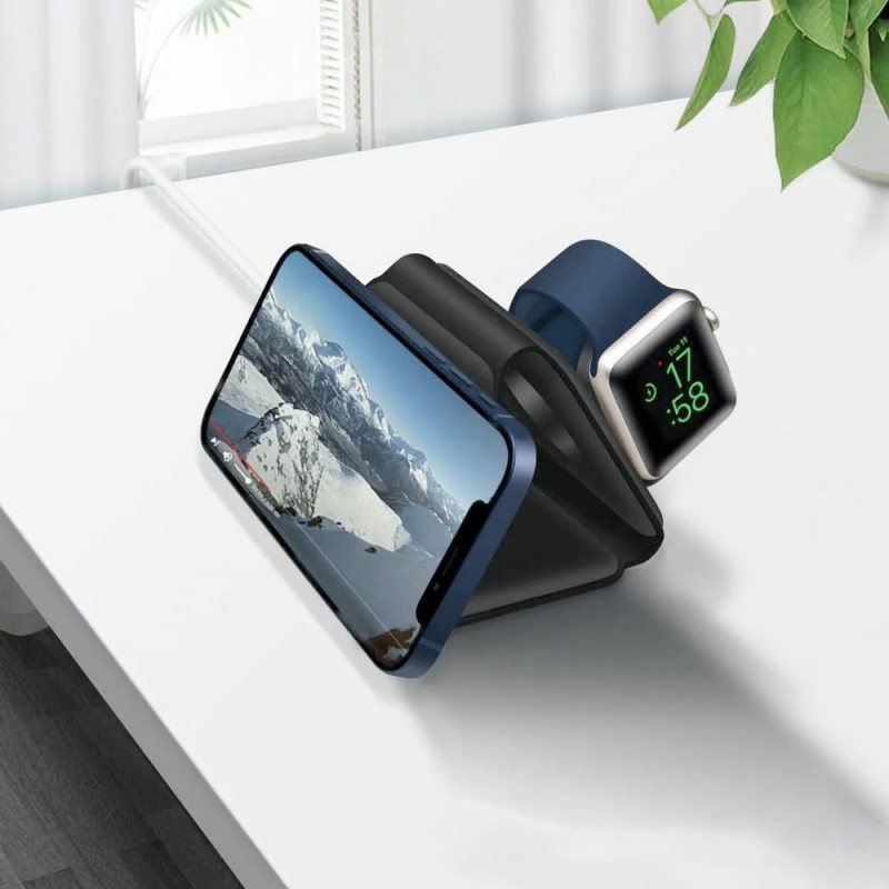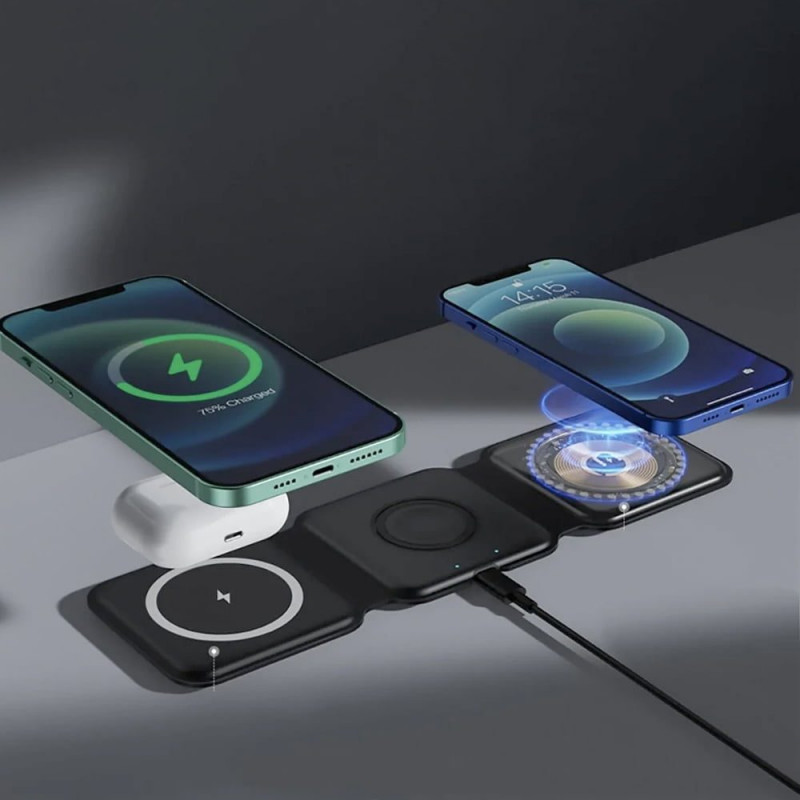 Standul multifunctional de incarcare wireless poate incarca telefoane mobile, ceasuri si casti wireless in acelasi timp. Compatibil cu iWatch 6/5/4/3/2/1. Design cu afisaj dual-light, starea de functionare este clara dintr-o privire, lumina albastra din dreapta este aprinsa, este starea de incarcare a castilor; lumina albastra din stanga este aprinsa, este starea de incarcare a telefonului. Iluminarea moale si ascunsa este perfecta pentru incarcarea telefonului atunci cand dormiti si nu vreti sa va deramjeze nicio lumina. Dupa ce incarcarea wireless a fost conectata la sursa de alimentare, trebuie doar sa plasati usor dispozitivul in mijlocul pozitiei corespunzatoare pentru a-l incarca. Materialul siliconic moale poate fi indoit si pliat in mod repetat. Cu design magnetic triunghiular, incarcatorul wireless poate fi pliat intr-un incarcator cu un singur dispozitiv care economiseste spatiu sau il puteti pune plat sau intr-un mod triunghiular in picioare pentru a incarca trei dispozitive in acelasi timp. Incarcatorul este subtire si compact, usor de transportat, foarte potrivit pentru acasa, birou, calatorii, vacanta etc.
