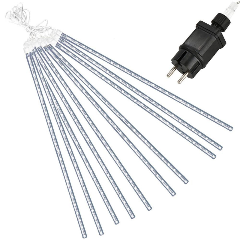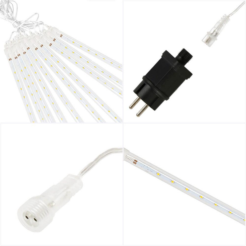 Ne apropiem de sarbatori... Lampile cu meteoriti arata grozav pe un pom de Craciun, pe arbustii din gradina sau usor agatate pe o balustrada de balcon. Sunt accentul perfect pentru a crea o atmosfera festiva in jurul tau. Efectul meteorilor in cadere este impresionant! Lasa-te purtat de atmosfera de sarbatoare si fa ca sarbatorile sa fie speciale pentru tine si familia ta. Lampile sunt de inalta calitate si le poti folosi atat in casa, cat si afara. Functioneaza excelent creand efectul caderii zapezii.Lampile sunt compatibile, ceea ce inseamna ca le puteti combina in seturi. Puteti combina pana la trei seturi de lumini.Conectorii ermetici au clasa de etanseitate IP44, ceea ce inseamna ca sunt adaptati pentru utilizare in exterior fara a fi nevoie de izolatie suplimentara. Butonul controlerului este sigilat. Sarma groasa de cupru este rezistenta la rupere sau la temperaturi scazute. PARAMETRII: Culoarea albnumar de meteoriti 10 bucdiametrul meteorit 11 mmdistanta dintre meteoriti este de aproximativ 40 cm Efect de lumina in cadere Lungimea cablu cu meteoriti 4mlungimea cablului de alimentare 2mlungime totala 6mlungimea meteoriti 50 cm480 lumini micro LEDsursa de alimentare 220-240v LED-uri cu economie de energie Alimentat electric Arderea unui LED nu opreste setul!Lampi pe fire de cupru durabile cu diametrul de 1,3 mm, rezistente la rupere Certificat CE, Ro HSClasa de etanseitate IP44 Utilizare externa si interna Posibilitatea de a conecta pana la 3 bucati de lanturi usoar