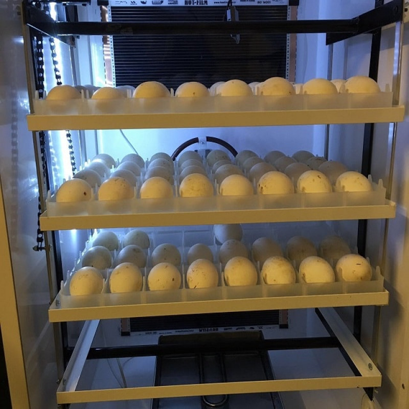 - Incubatorul are 3 etaje, fiecare cu cate o sita de incubatie si o lada de ecloziune. Ouale se aseaza in site de plastic speciale si cu ajutorul motorului dispus in interiorul incubatorului acestea se rotesc cu 45 grade fata de axul central.