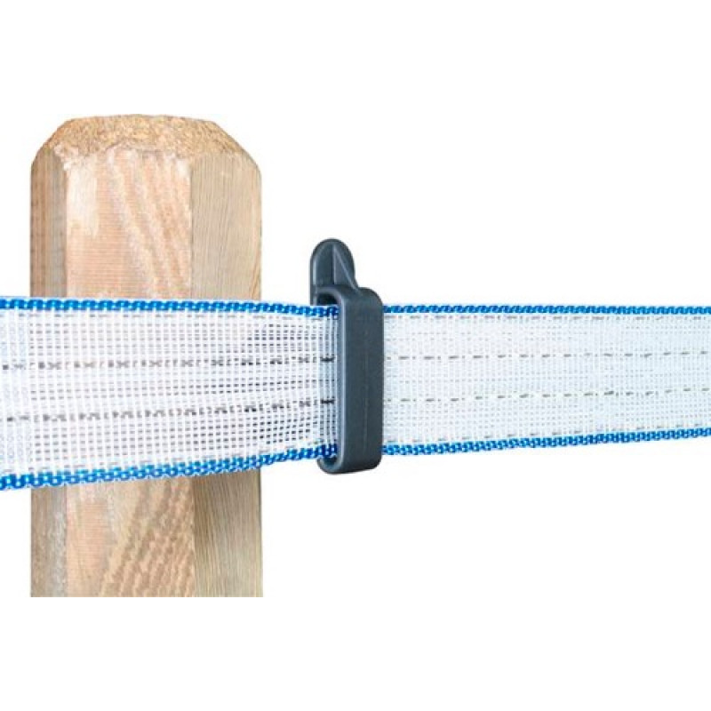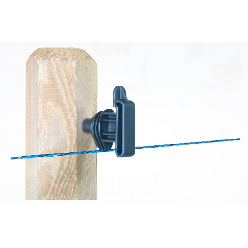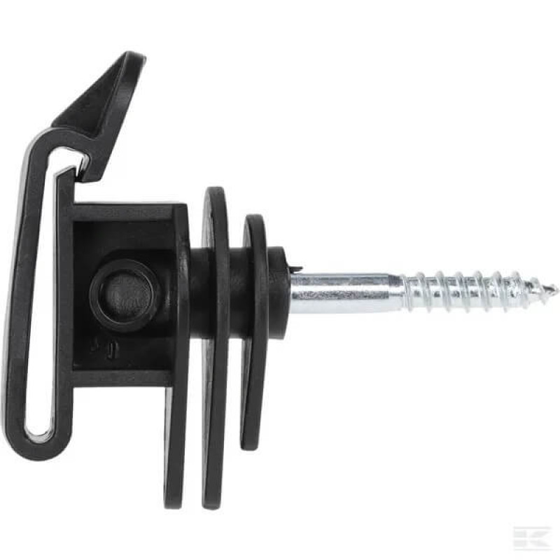 Izolator fir, cordon si panglica pana la 40 mm pentru gardul electric, se insurubeaza usor in stalpul din lemn. Pentru un gard cu lungimea de 1000 m se recomanda folosirea unui numar de 120 izolatori (distanta dintre stalpi 8,33 m)