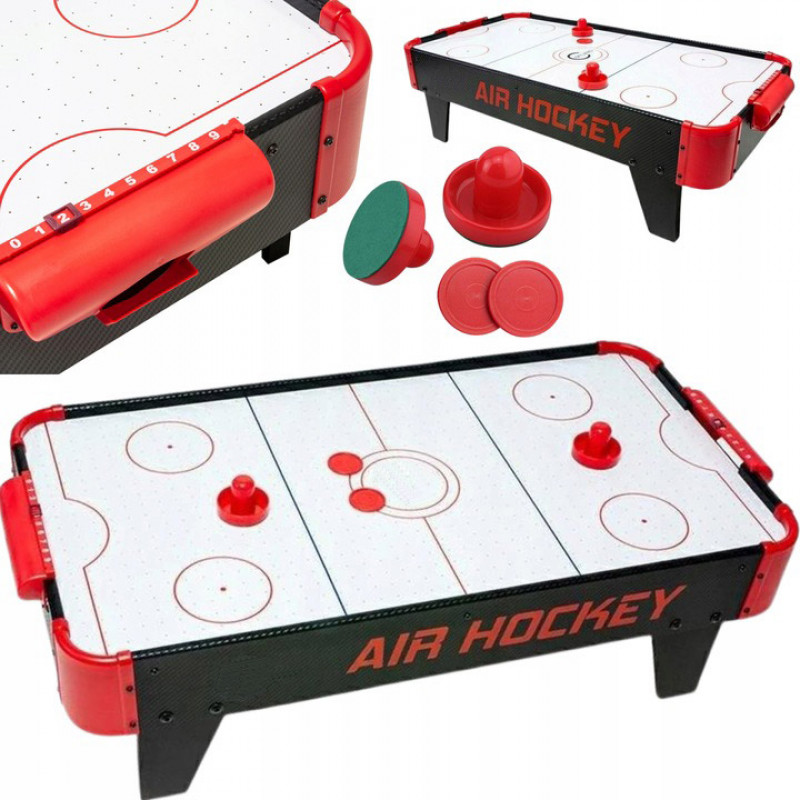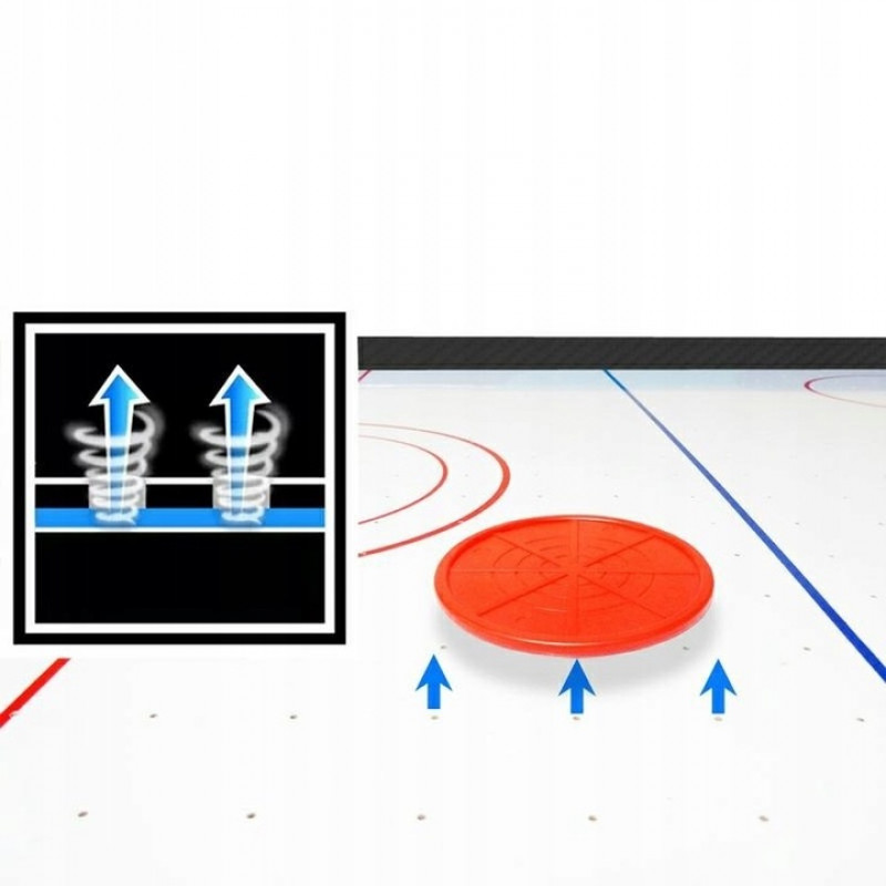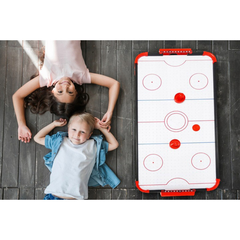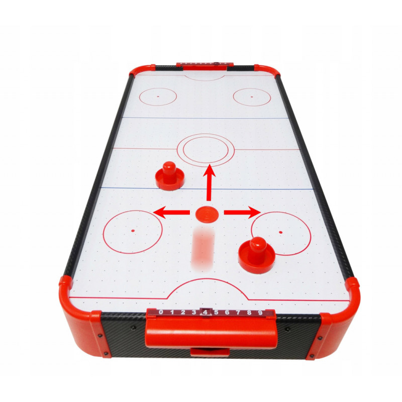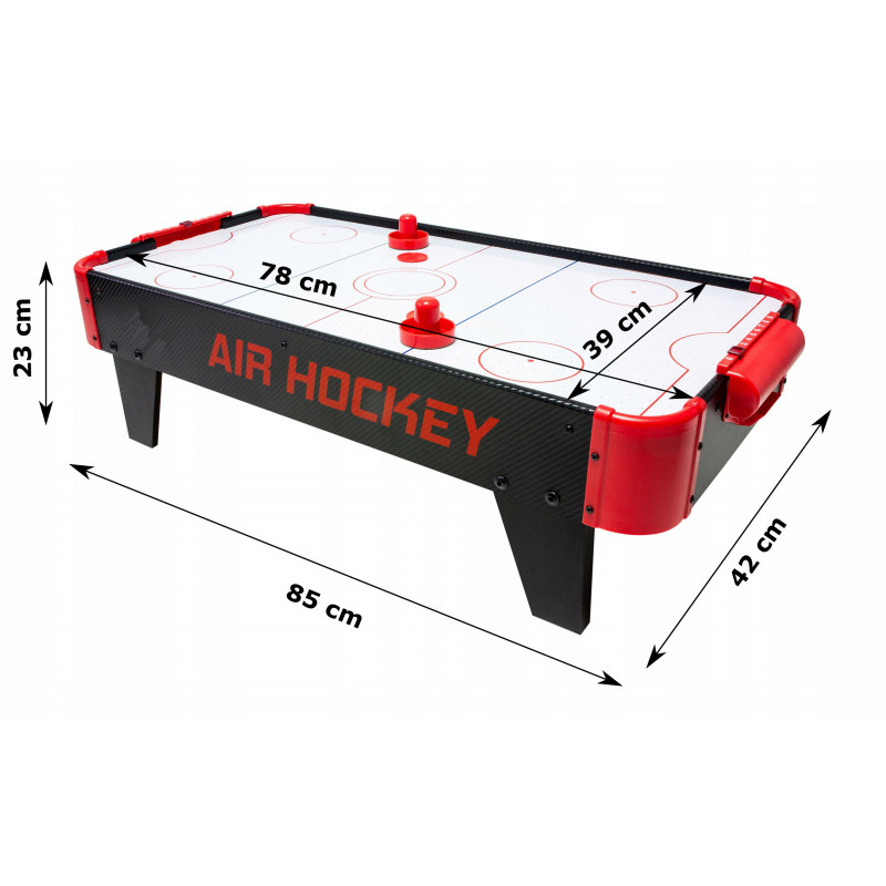 Putere baterie: 6x AA (nu este inclusa) O modalitate excelenta de a-ti petrece timpul liber in mod activ cu prietenii tai. Masa este solida si stabila, asa ca va oferi divertisment sigur pentru ore lungi. Dimensiunea compacta permite depozitarea si transportarea usoara, asigurand distractia oriunde pe o masa sau pe o suprafata plana.Include doua pucuri, doua impingatoare (ciocane) si doua poligoane de tragere glisante pentru numararea punctelor. Calitate superioara Fabricate din lemn durabil si PVC, picioarele sunt puternice si echipate cu tampoane de cauciuc care nu lasa semne, protejeaza toate suprafetele mesei.Masa de air hochei este un joc sigur si captivant atat pentru copii, cat si pentru adulti. Asamblare usoara Aceasta masa de hochei compacta poate fi asamblata in 10 minute. Pur si simplu atasati cele 2 porti si cele 4 picioare captusite. Masa este gata de joc!Sistem de suflare a aerului Ventilatorul electric ofera un flux de aer puternic, dar silentios si uniform, oferind o suprafata de joc neteda si fara frecare, permitand discului sa alunece lin pe masa pentru o experienta de joc distractiva si realista. Accesorii incluse Masa de air hochei pentru copii vine cu toate accesoriile, inclusiv 2 mini pucuri, 2 mini impingatoare si 2 optiuni de tablou de bord.Contoarele portabile pentru hochei de masa ajuta la urmarirea numarului total de goluri pentru a obtine scorul corect. Masa de air hochei include tot ce ai nevoie pentru un joc provocator si captivant. Perfect pentru petreceri, excursii la pub sau nopti de jocuri in familie. Acest joc de masa de hochei va aduce familiei, copiilor sau prietenilor o multime de distractie atat in interior, cat si in aer liber.
