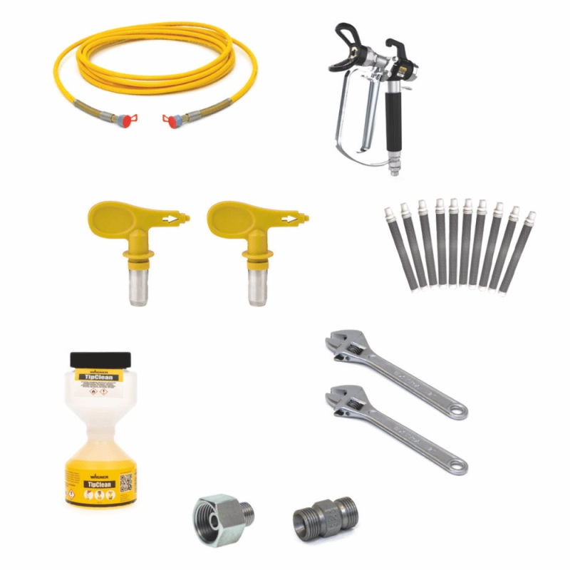 Pentru toate pompele cu conexiuni ½ ” Include adaptor si 2 x chei reglabile Pentru modelele: PS 3.39, HC 750, HC 950, HC 970 incl. SSP Continut kit: • Adaptor montare (F) NPSM 1/2 "la (M) NPMS 3/8" • Furtun de inalta presiune DN 6; NPSM 3/8 ", 15m (max. 25 Bar) • Conector dublu de la 3/8" NPSM la 1/4" NPSM • Pistol AG 14 (filet G) • Extensie duza filet G 30cm • Duza - TradeTip 3 335 • Duza - TradeTip 3 439 • Recipient curatare duze TipClean 200 ml • 2 x chei reglabile • Filtre albe (10 bucati) *imagine ambalaj cu titlu de prezentare