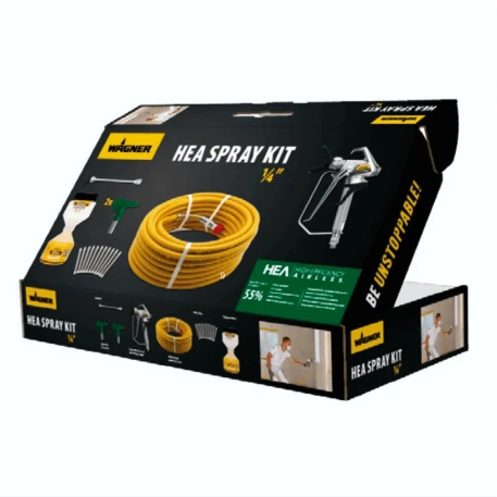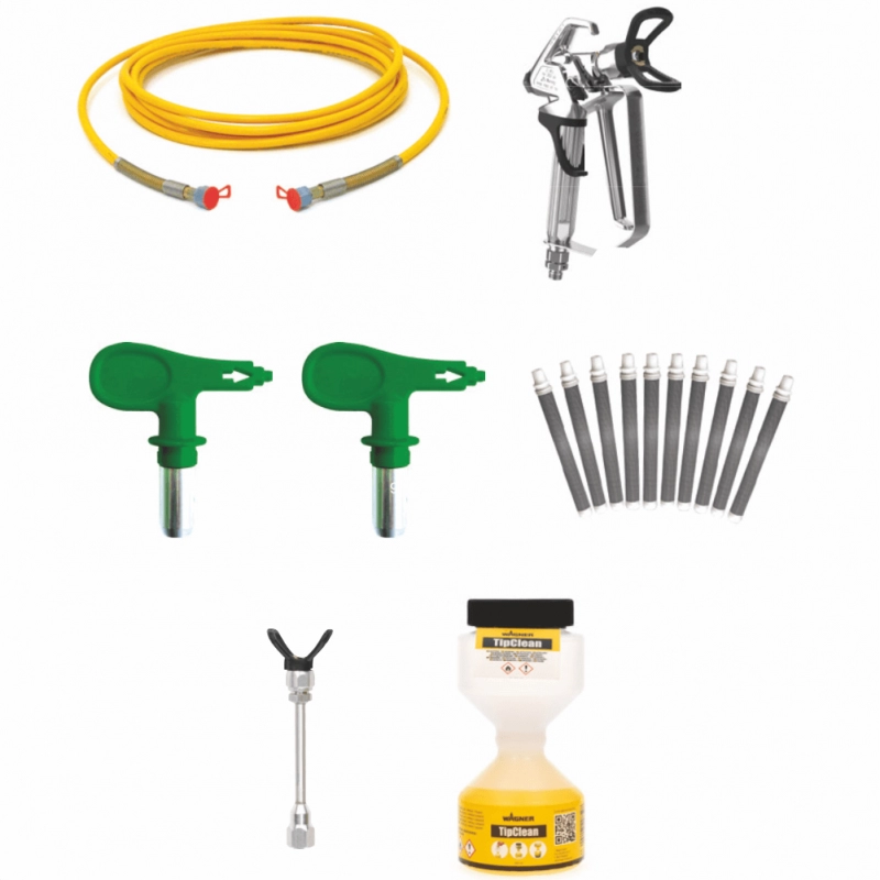Pentru toate pompele cu conexiune 1/4" Potrivit pentru toate pompele SuperFinish si ProSpray, dar si pentru Powerpainter 90 si IMPACT TITAN Continut kit: • Furtun de inalta presiune DN6; NPSM 1/4", 15m (max. 27 bar) • Pistol airless Vector Pro • Extensie duza filet G, 15 cm • Duza - HEA ProTip 517 • Duza - HEA ProTip 311 • Recipient curatare duze TipClean 200 ml • Filtre albe (10 bucati)